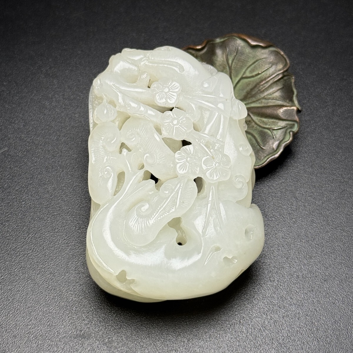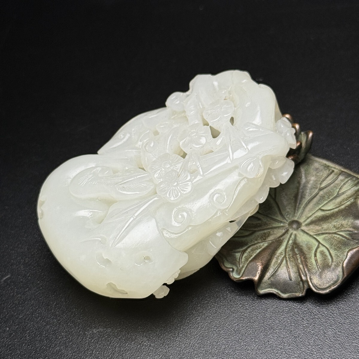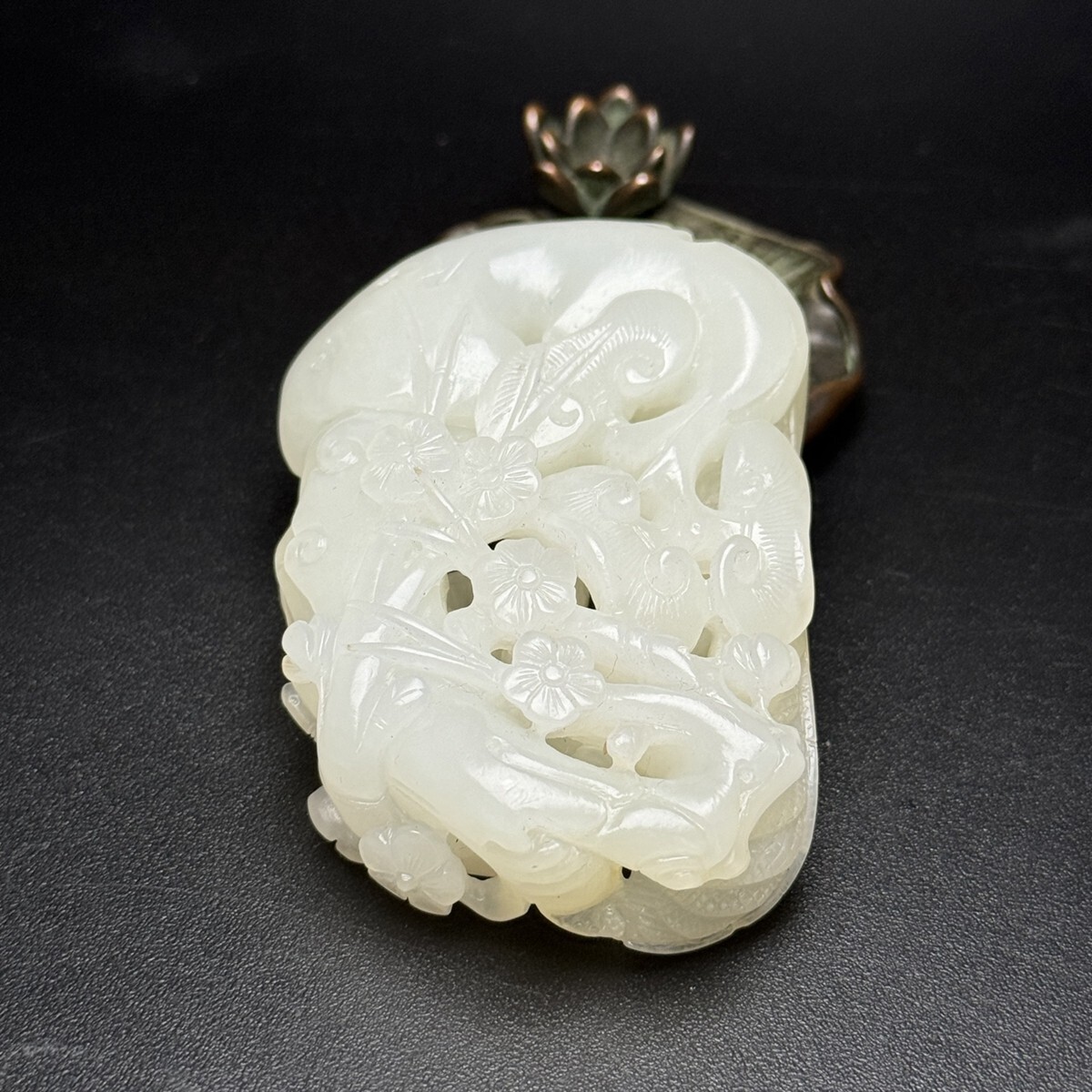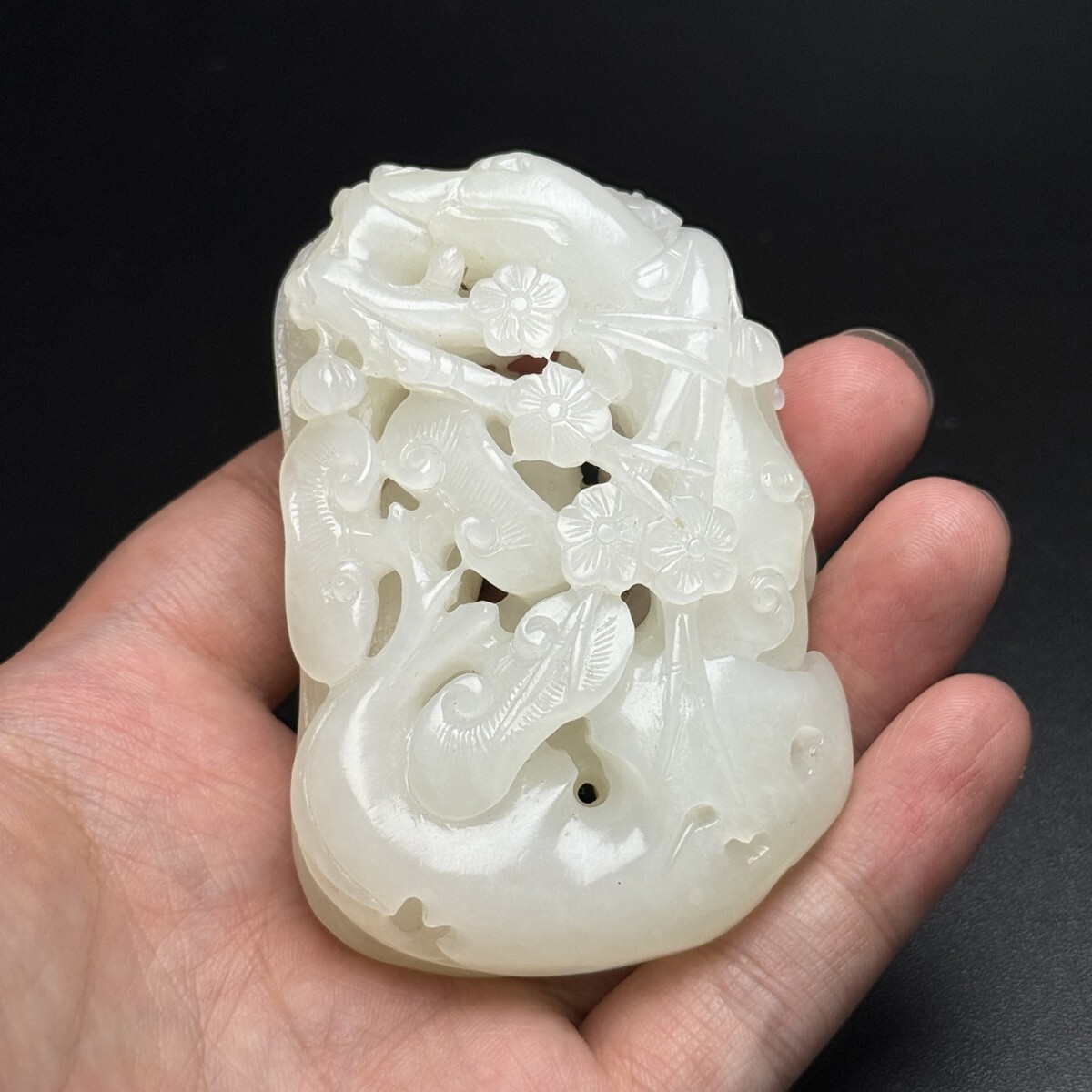 「清時代 和田玉 鏤空彫り 喜鵲登梅 掛件」極細工 裝身具 賞物 中国古美術 旧蔵出
