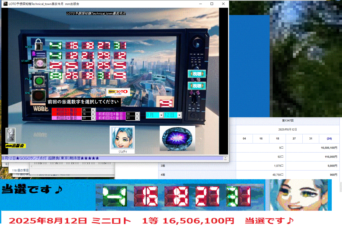 新作ロトソフト[LOTO予想探知機Technical_town嘉辰令月] 2025年8月12日 ミニロト 1等 16,506,100円 当選です♪