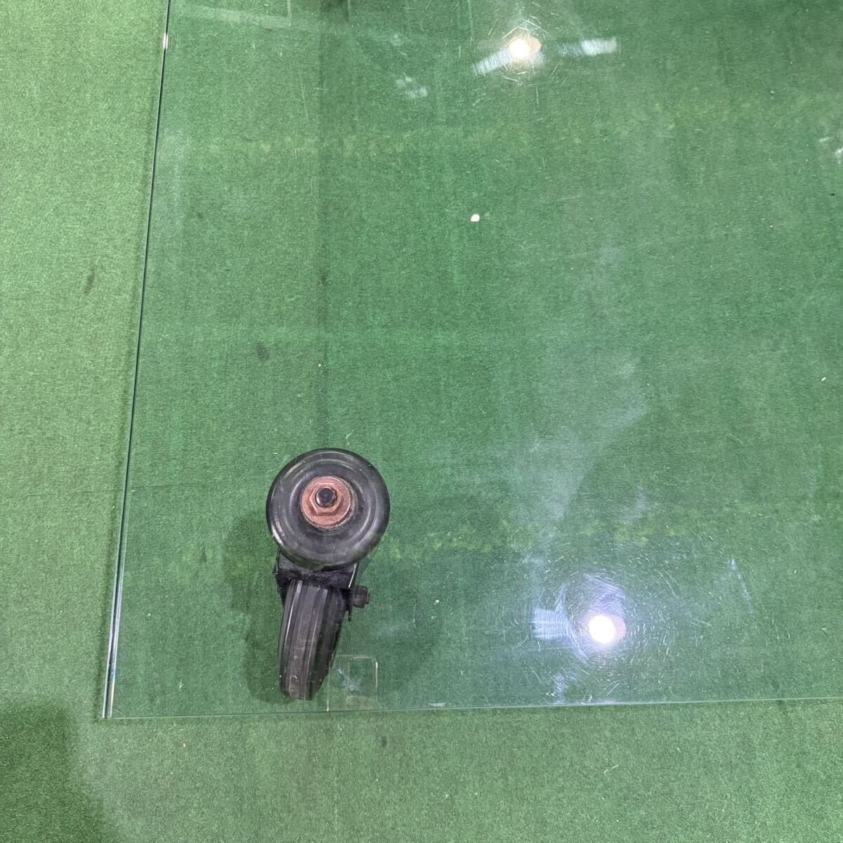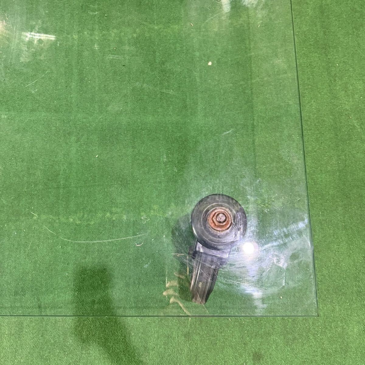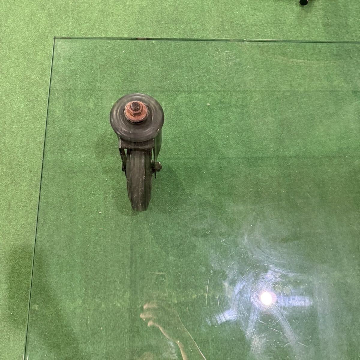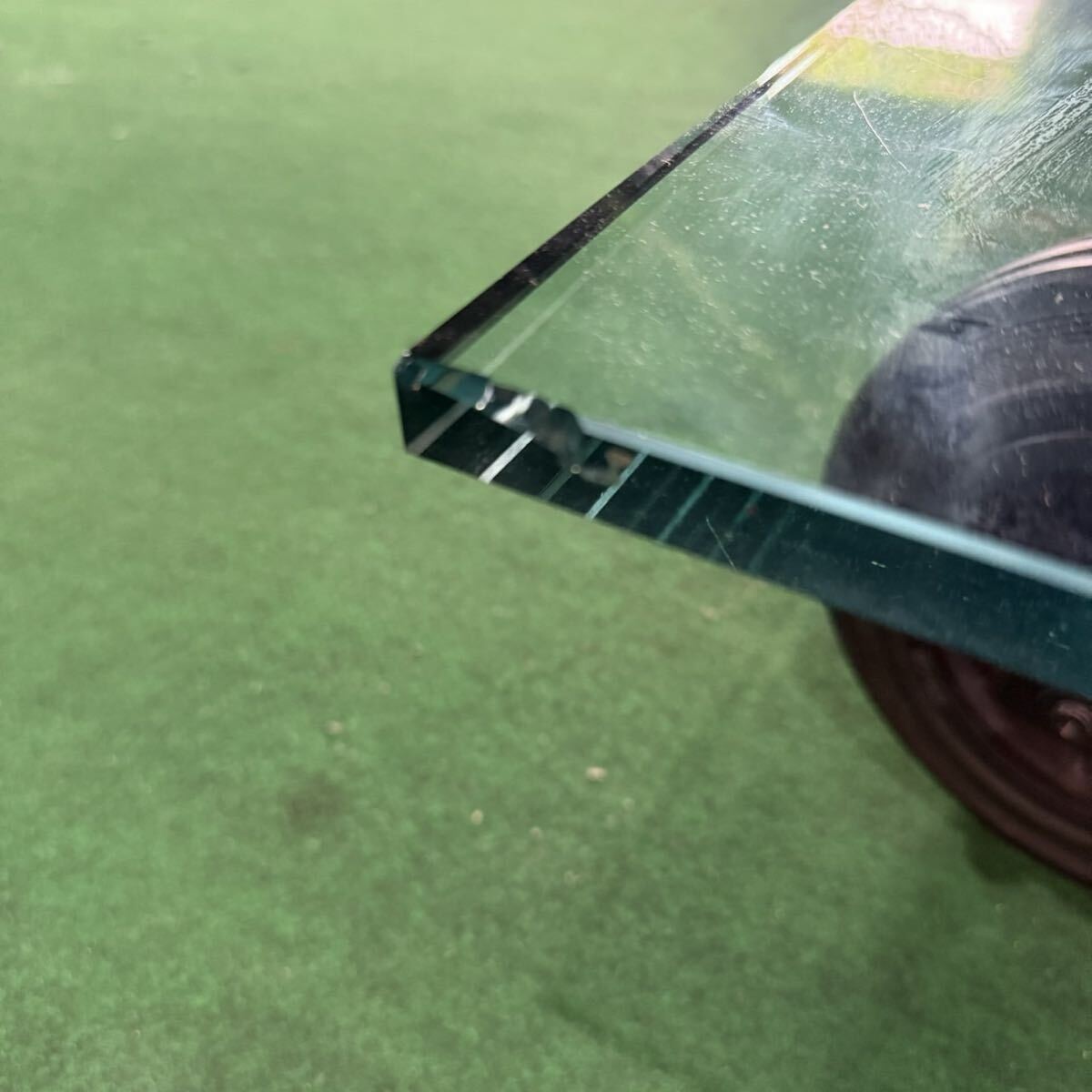 厚みのある強化ガラス天板と、インダストリアルなキャスター脚が特徴的なデザインで、リビングやラウンジ空間にスタイリッシュな雰囲気を与えます。