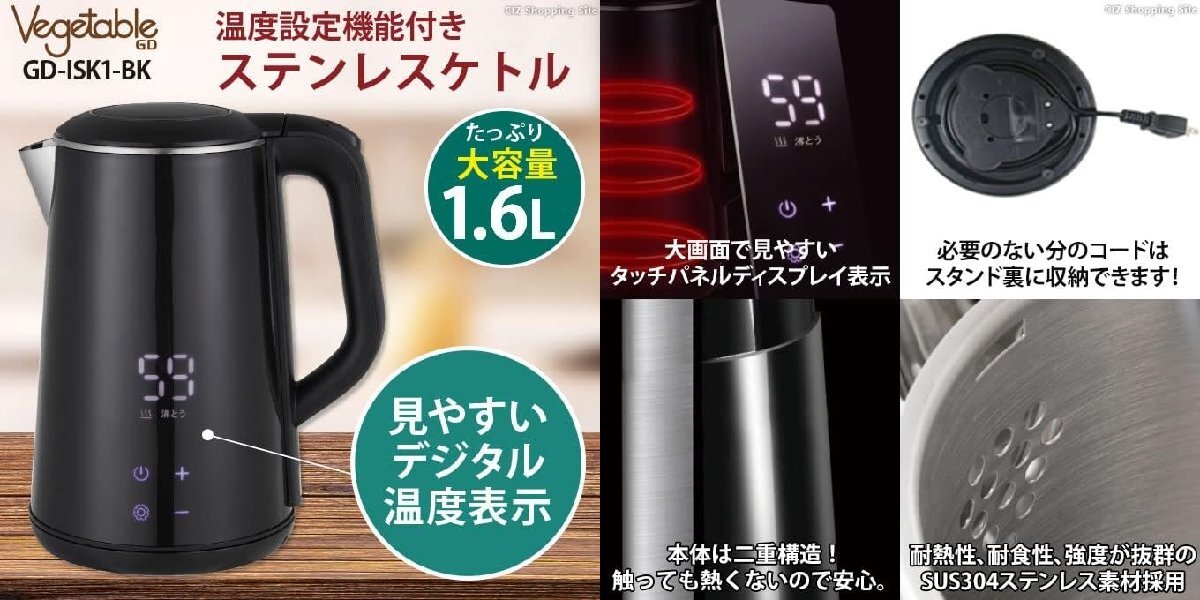 | Vegetable 温度設定機能付きステンレスケトル 1.6L GD-ISK1-BK |