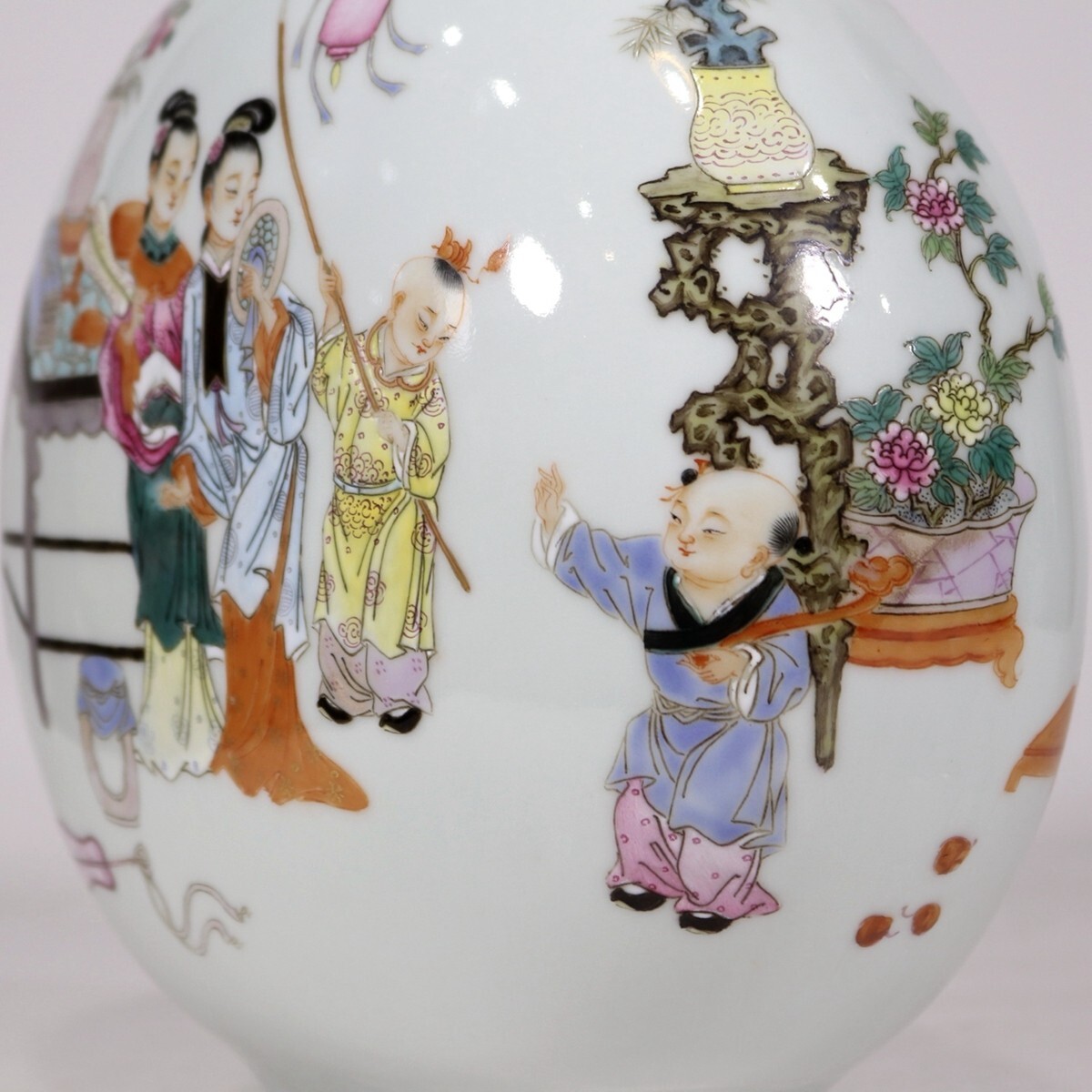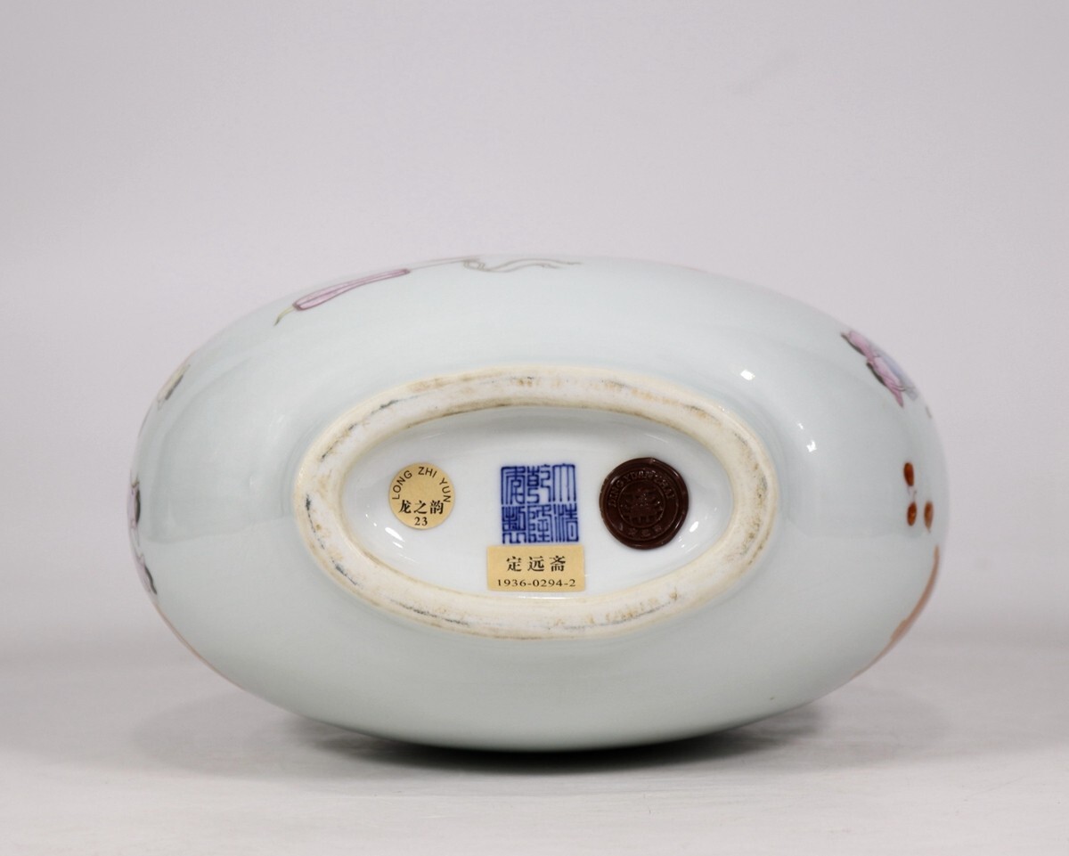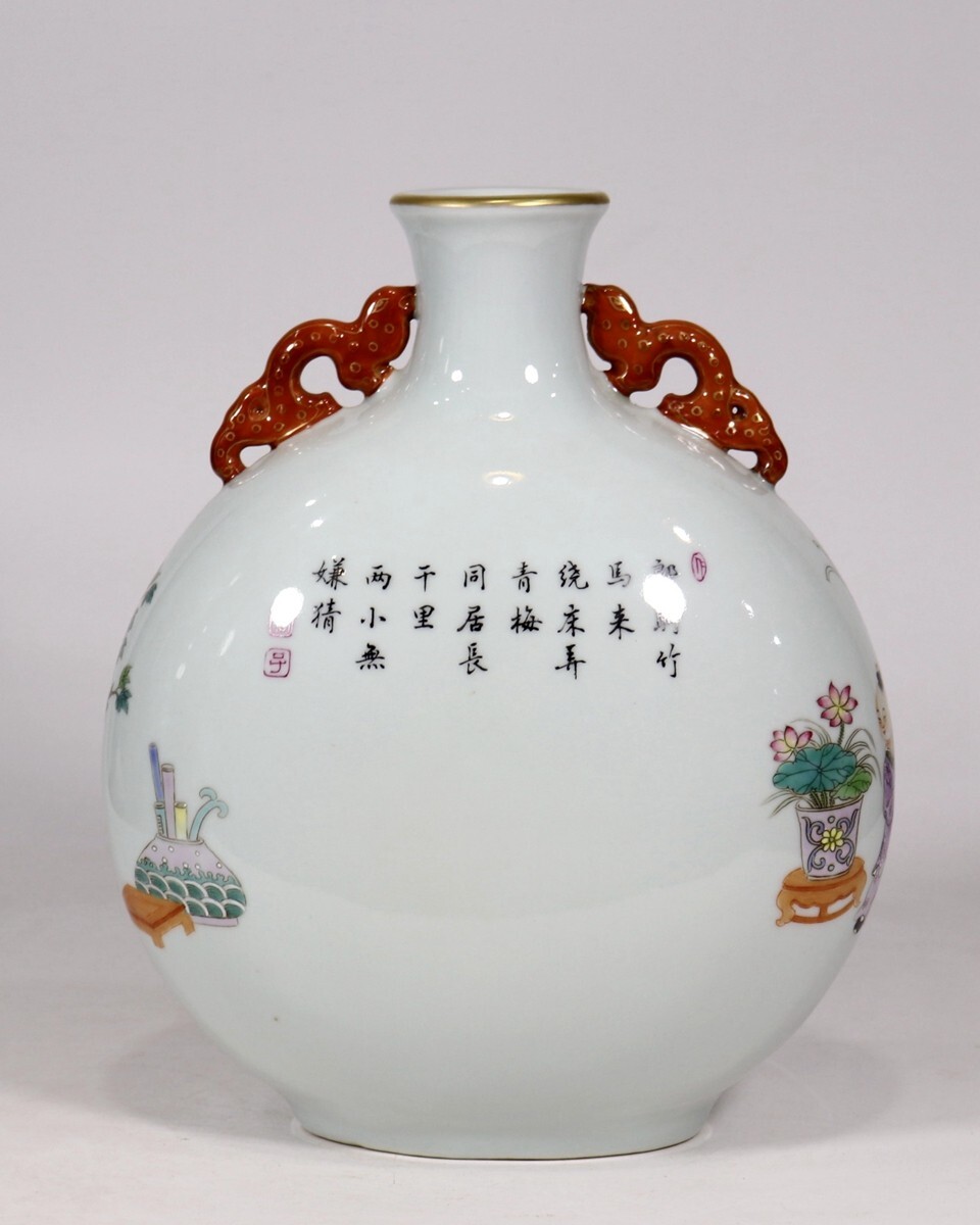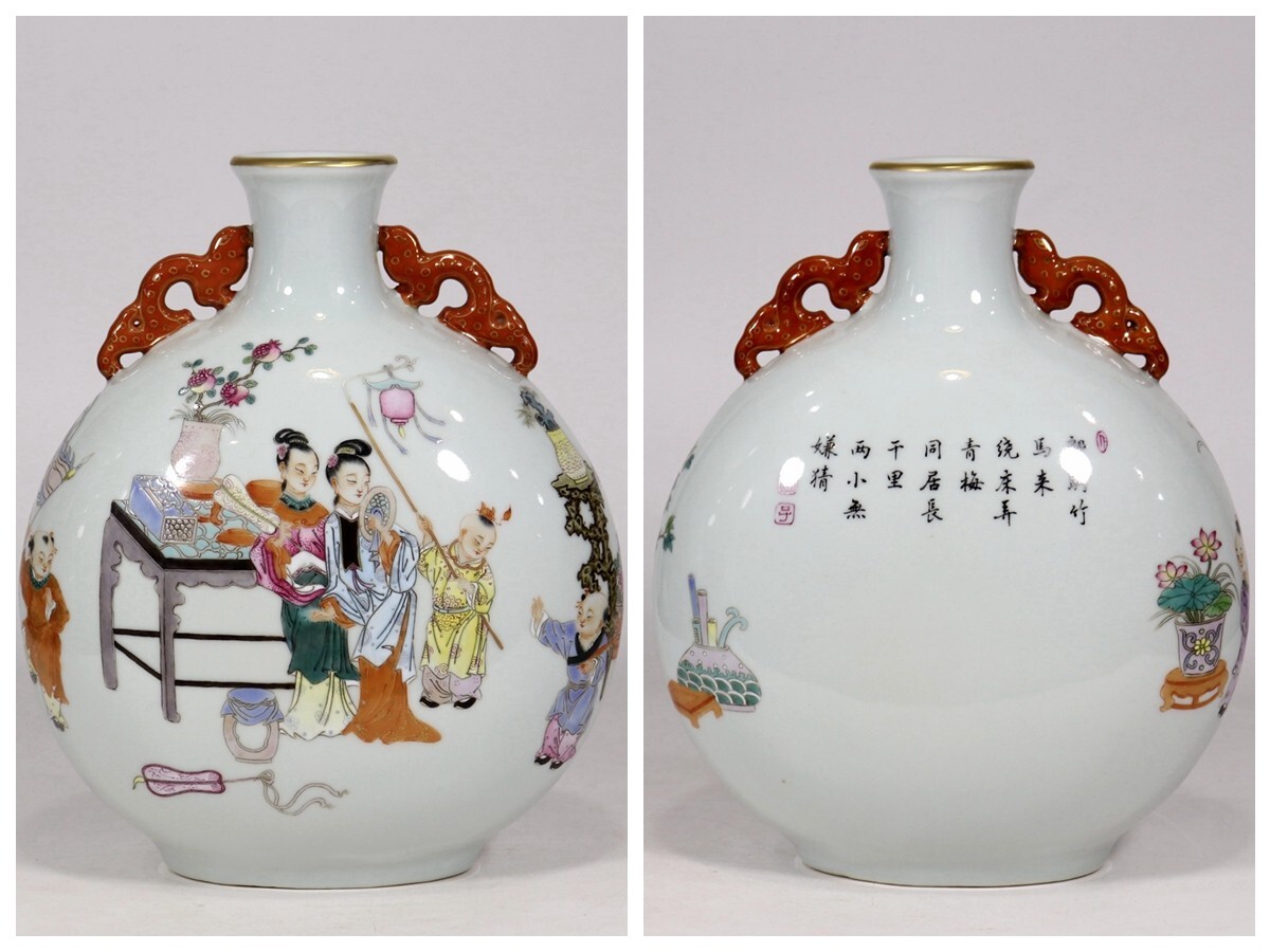清代 大清乾隆年製 陶磁器 粉彩三娘教子 詩文 抱月瓶【仁】染付 置物擺件 古賞物 古美術 中国古玩 蔵出