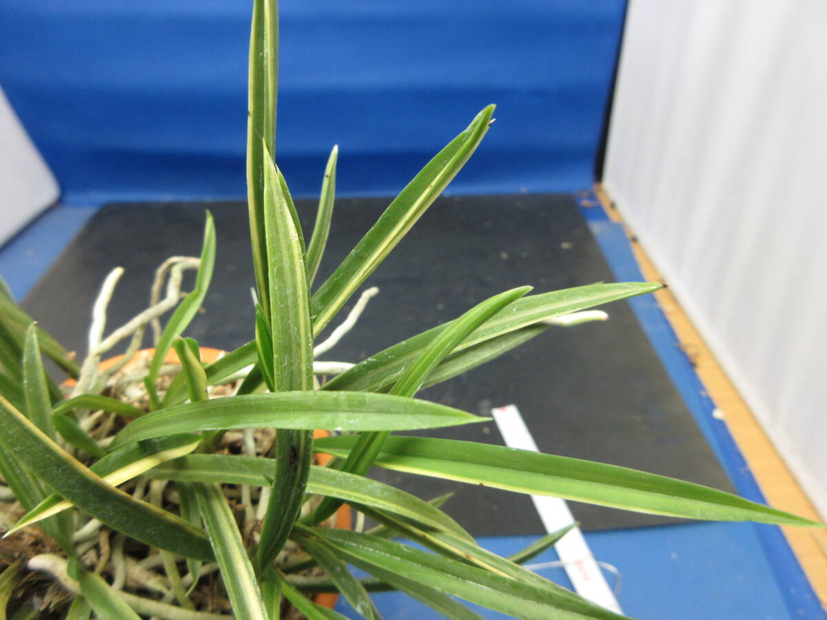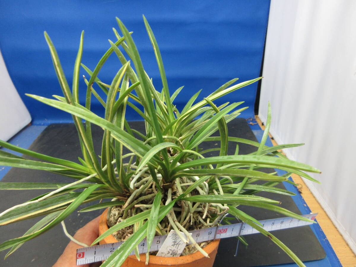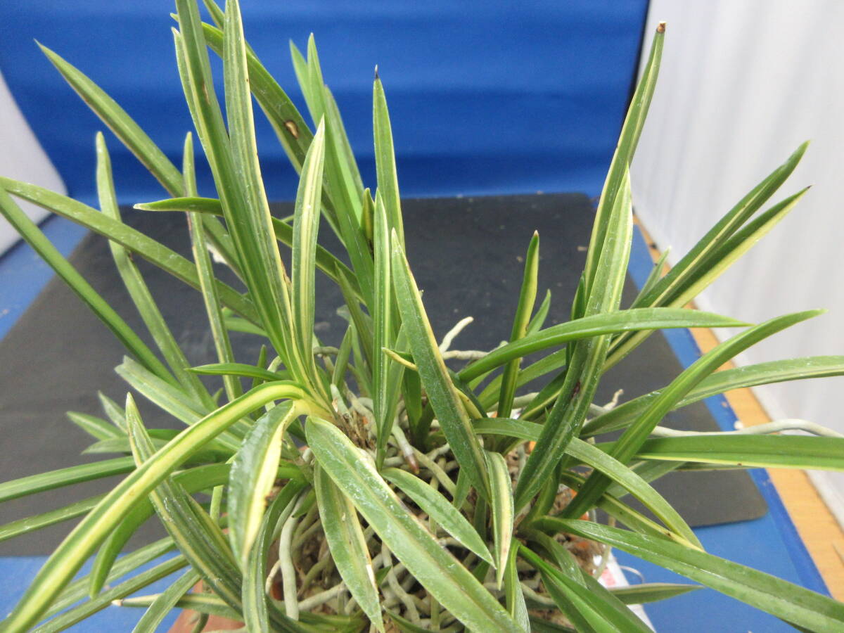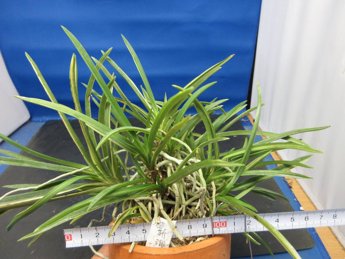 葉先が尖り白縞系の中型品種で紺性強く天冴えの白縞で縞の部分に青の散斑がのる、白縞の所に黒いスミがでる。覆輪になると、湖東の剣となります。