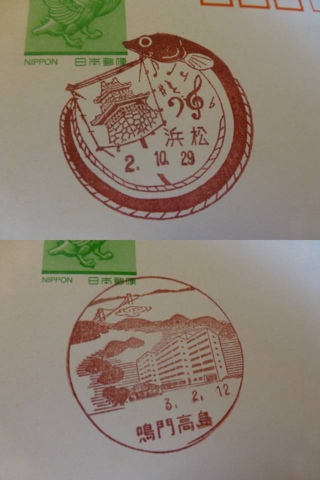 ☆鳥獣はがき 初日風景印 2枚 浜松 H2.10.29・鳴門高島 H3.2.12
