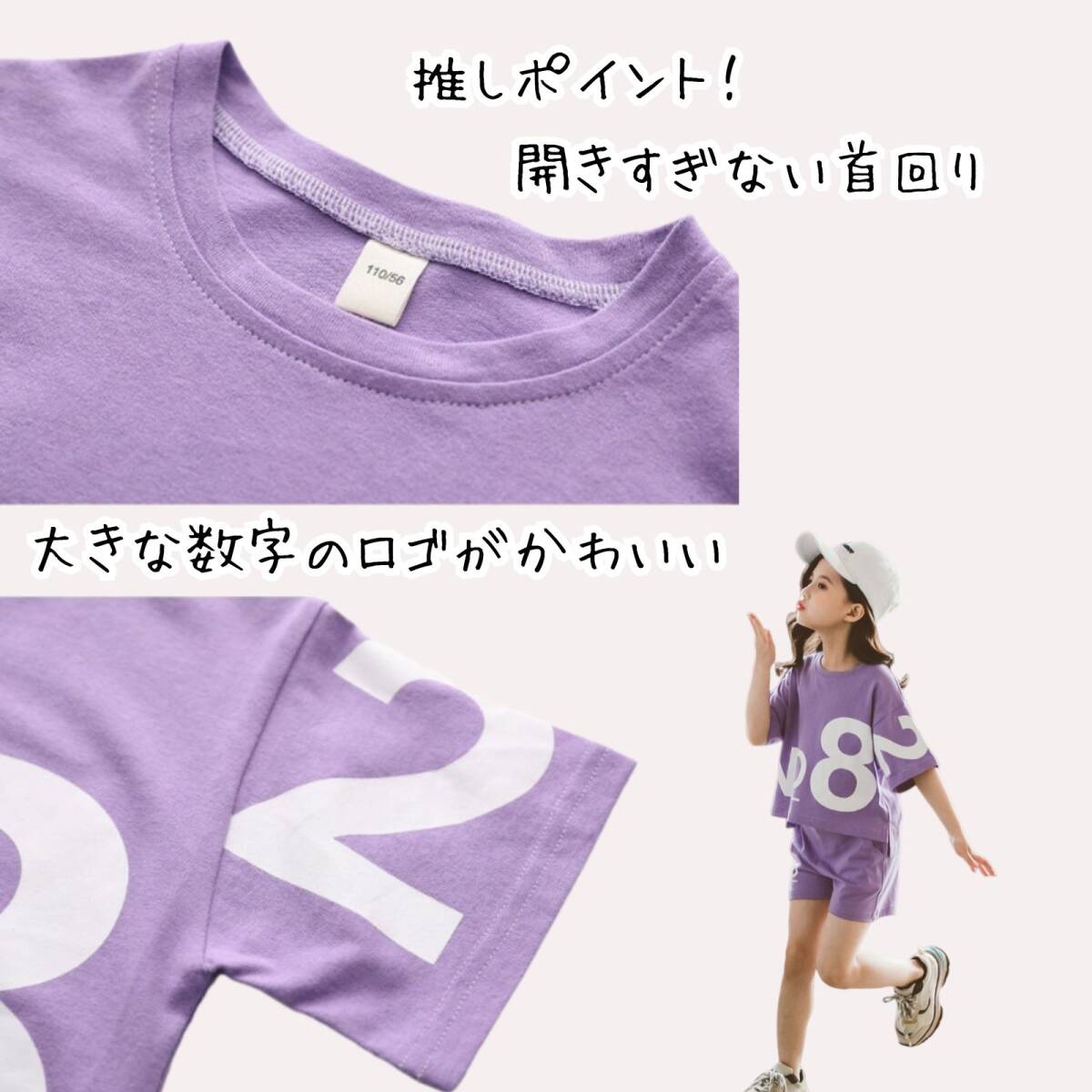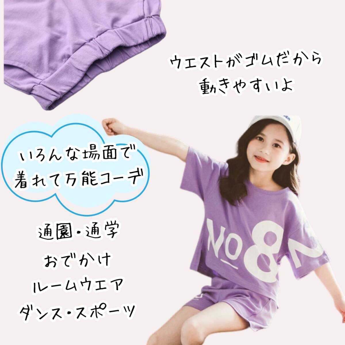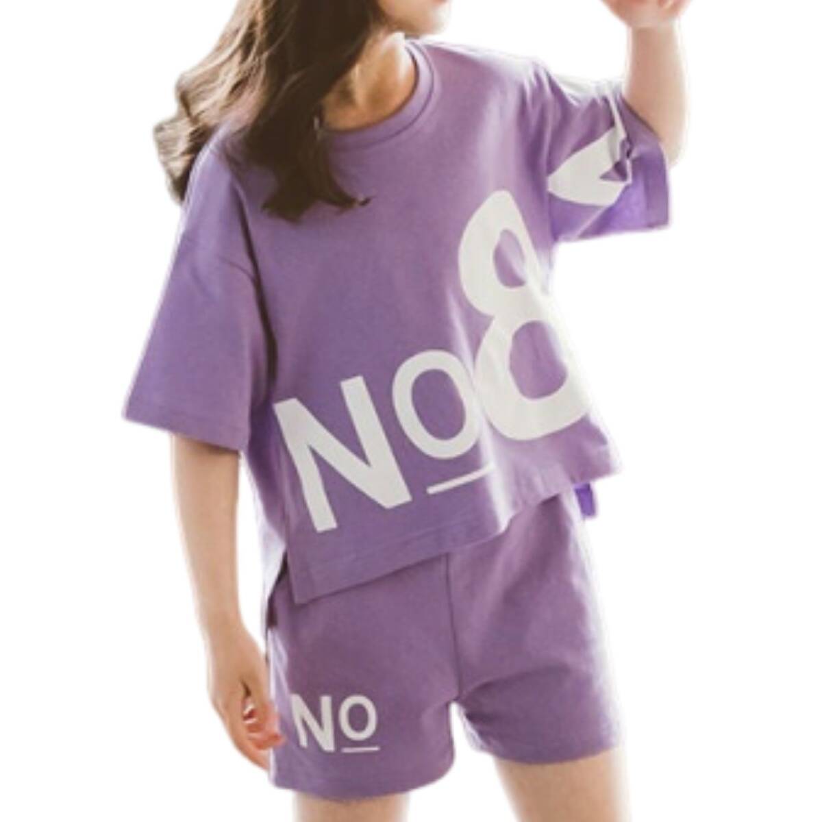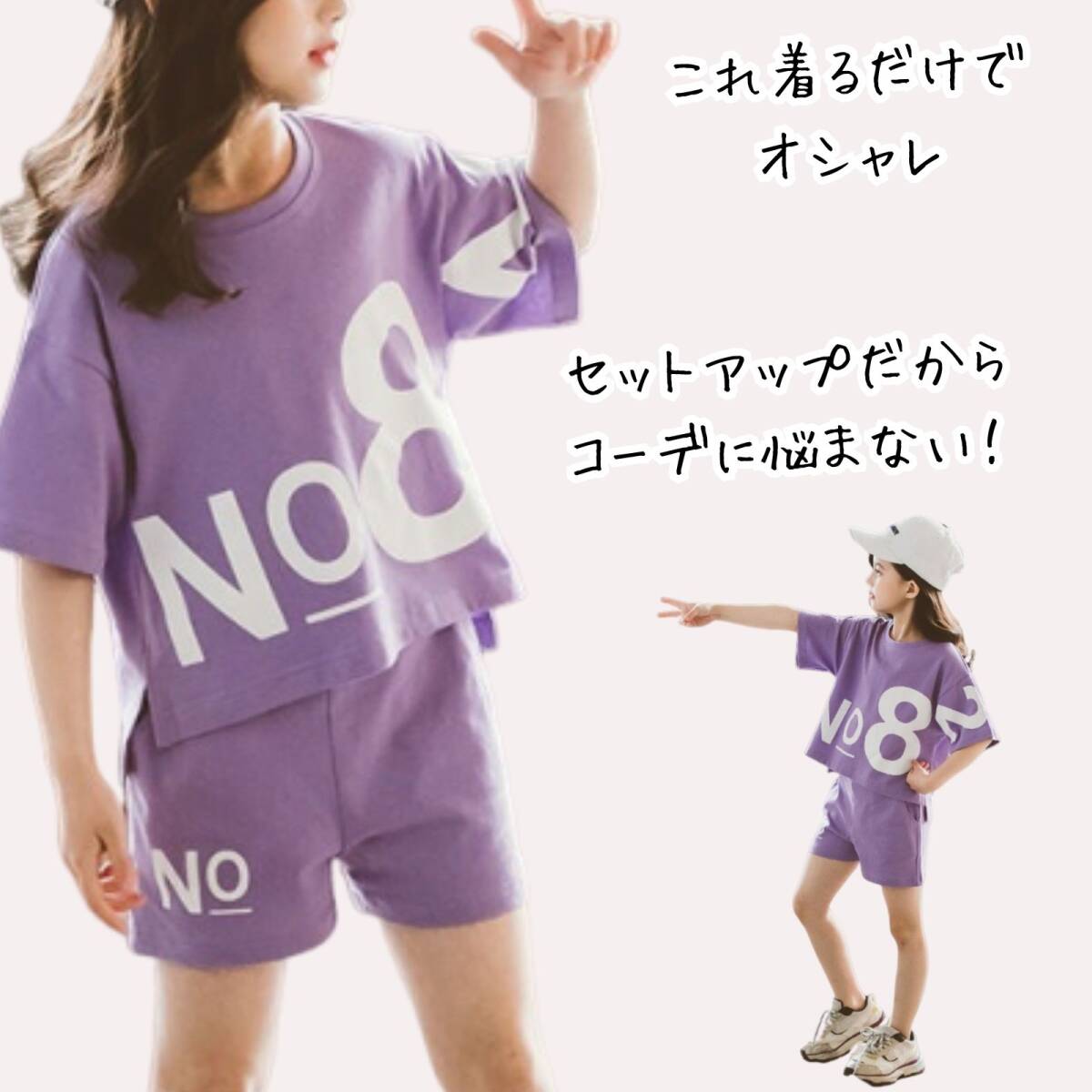 パープルの半袖Tシャツとハーフパンツのセットアップです。