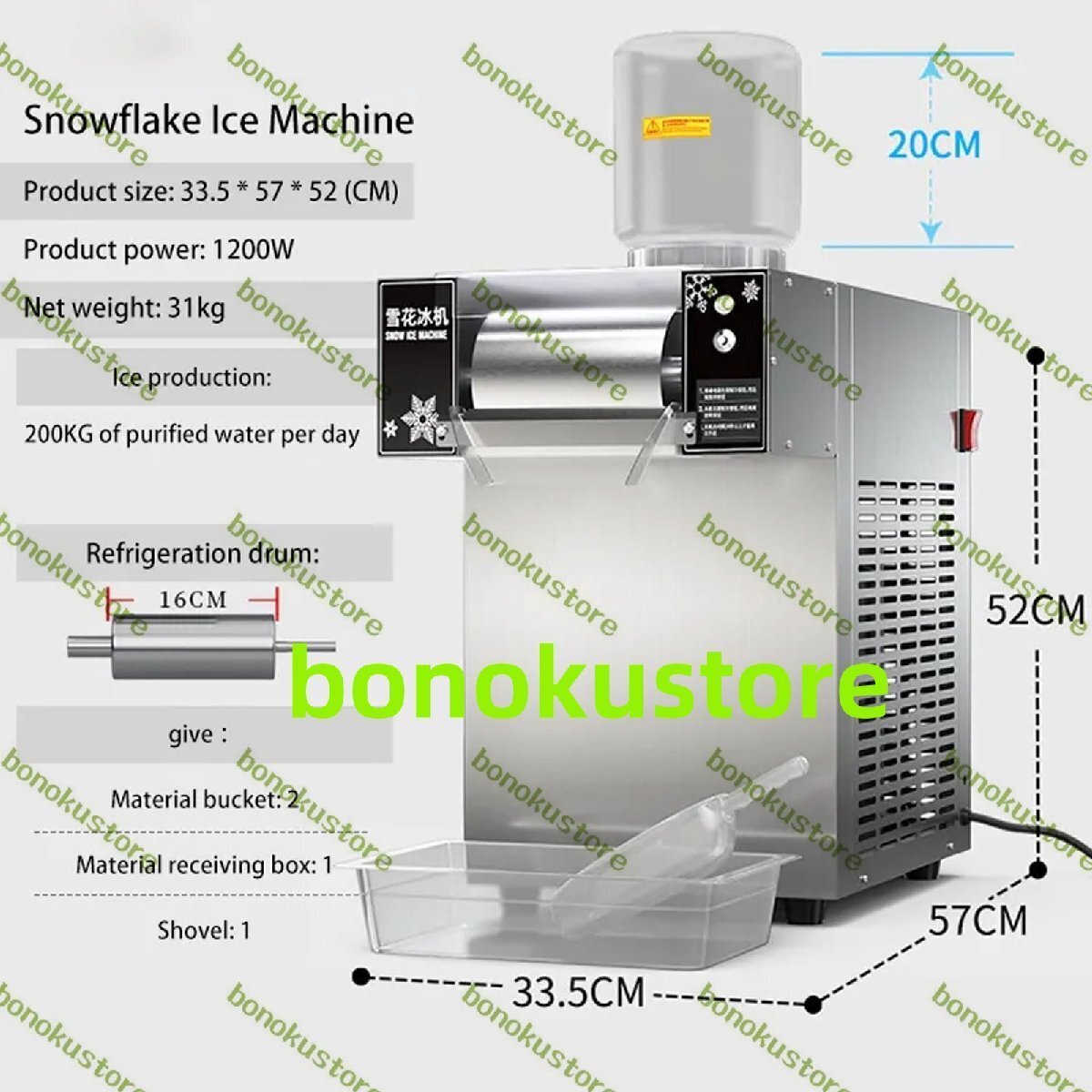 名前: スノーフレーク製氷機 電圧: 220V/110V 周波数: 50/60Hz 電力: 1200W 材質:ステンレス ローラー長さ:16cm 製氷能力:200kg/24時間 寸法: 335x570x520mm 重量: 31kg パック: 業務用ローラー製氷機 1台 素材ボックス1個 バレル2個 シャベル1個
