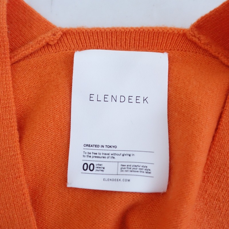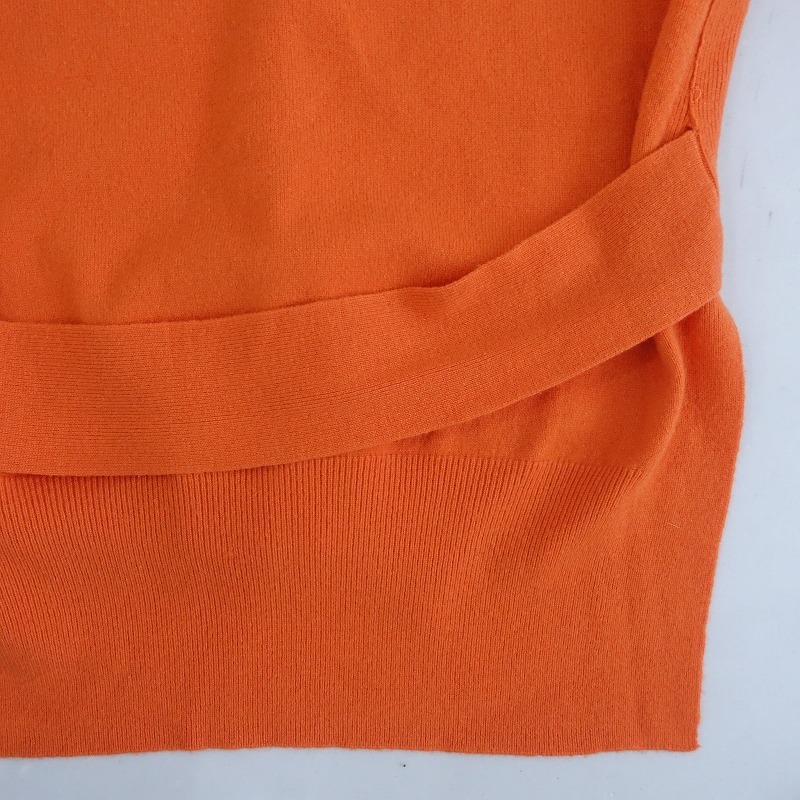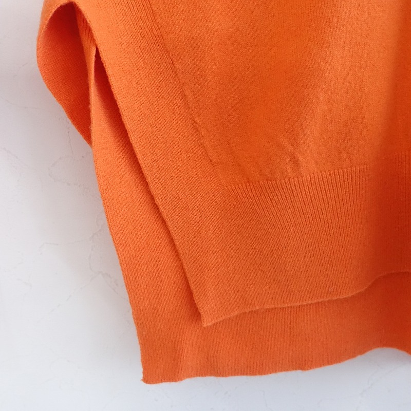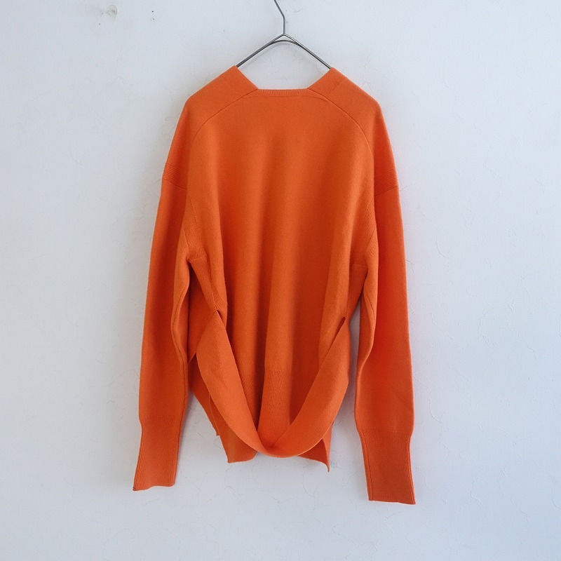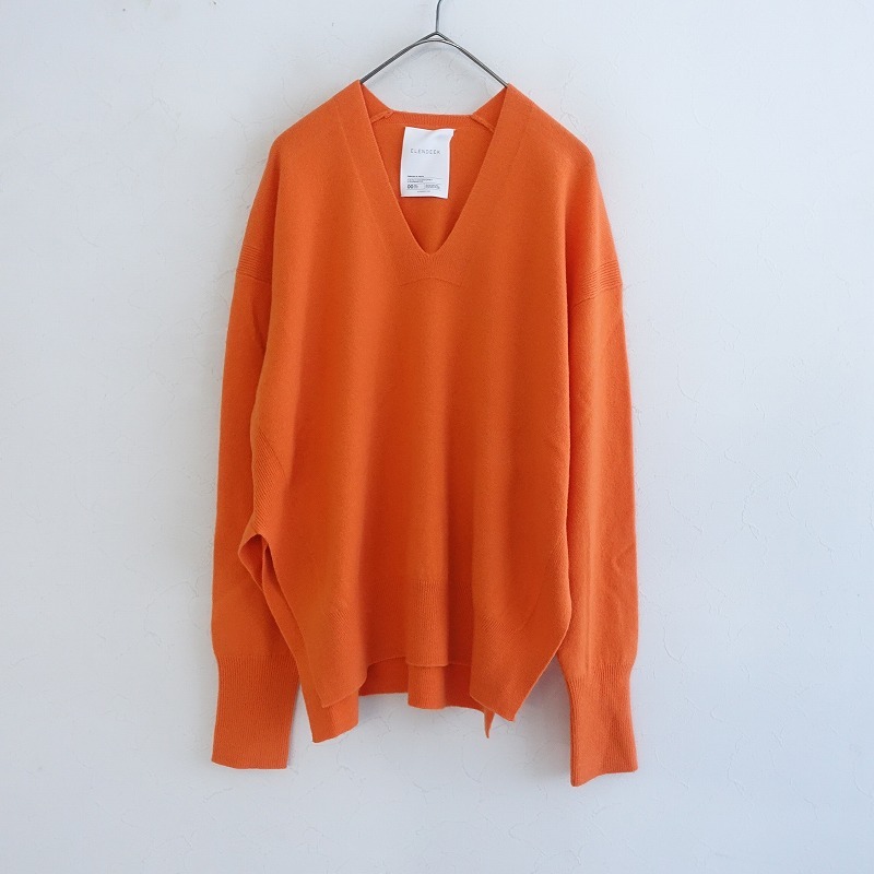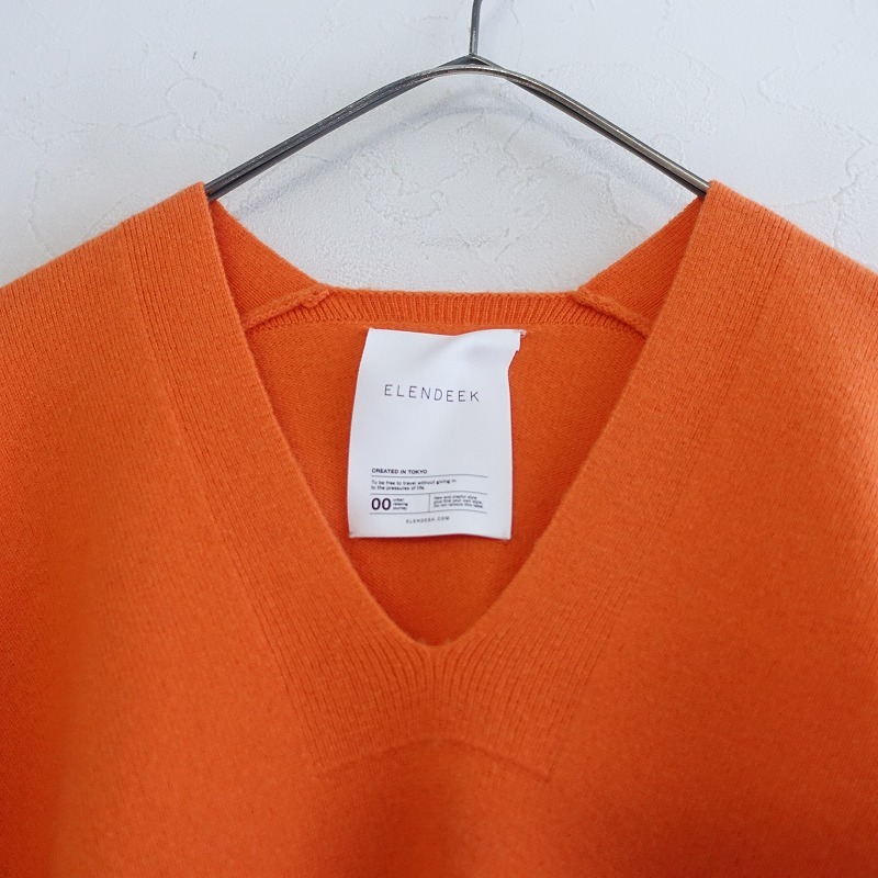 ELENDEEKのカシミヤベースニットVネックシンチバックプルオーバーです。カラーはオレンジです。カシミヤとナイロンのふっくらとした優しい肌触りのニットを使用。Vネックのプルオーバーです。袖口や、裾、袖ぐりからサイドにかけてはリブ編みであしらわれております。ウエストには垂れ下がった飾りタブベルトが施されております。前後の裾丈が少し異なり、裾サイドはスリット入りです。 |
