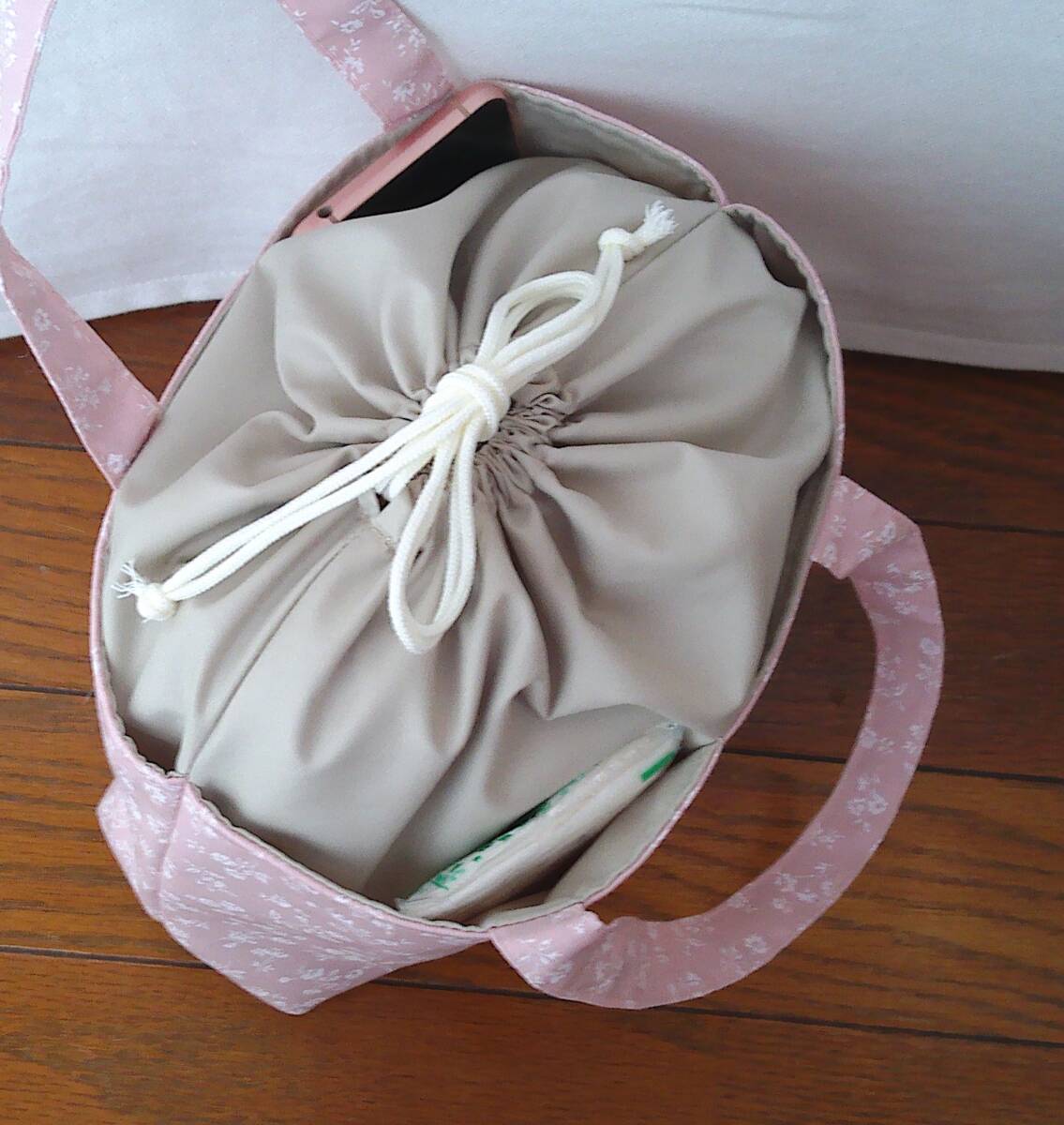 | ポケットいっぱい巾着バック★ピンク地白小花葉っぱ |