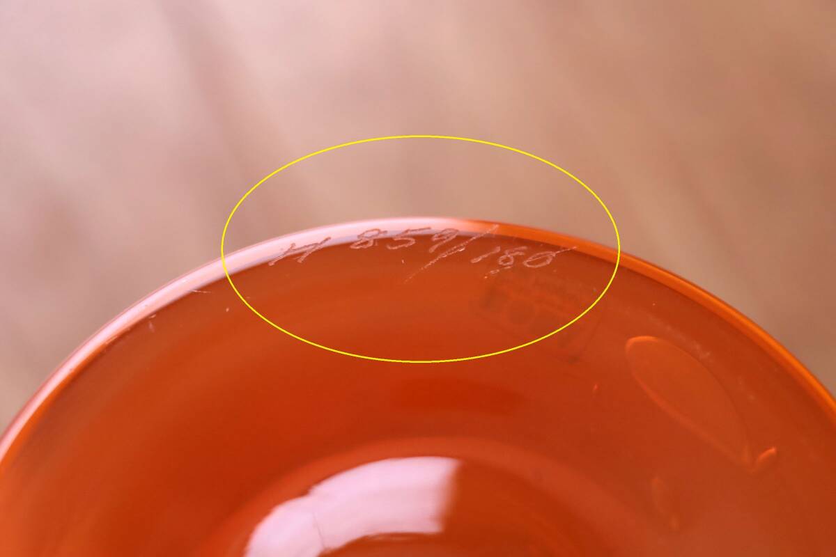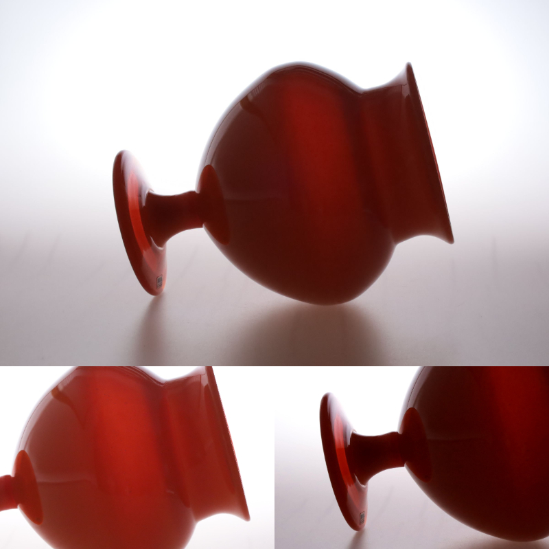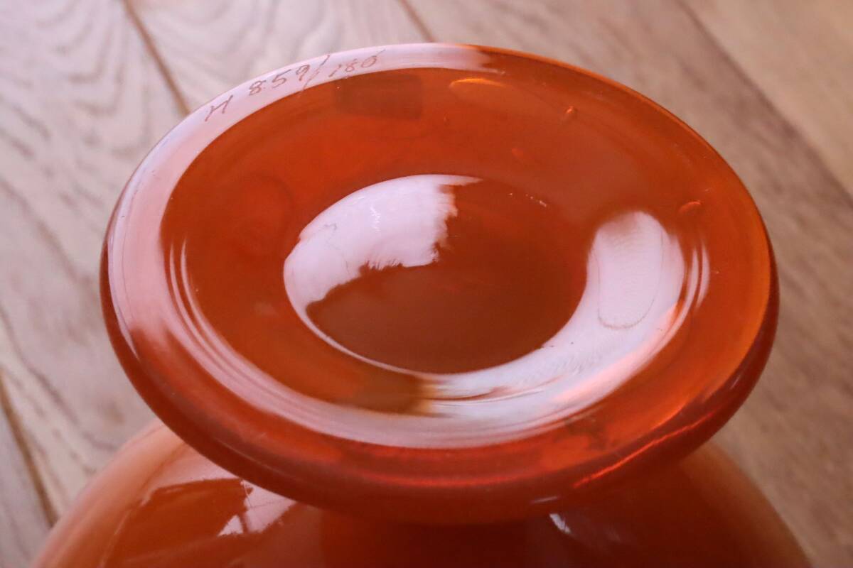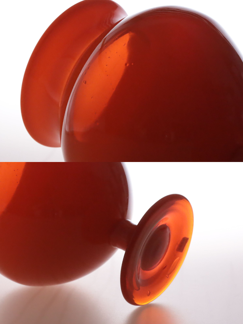 | 商品説明 | 品名:Glass Vase フラワーベース 花瓶 デザイン:Erik Hoglund エリック・ホグラン メーカー:Boda ボダ社 製造年代:1950年代-1970年代 カラー:Opaque Orange(半透明のオレンジ) サイズ:Φ15.5cm(最大径)H20.6m コンディション:外側は、多少の擦れはありますが綺麗です。底部は、擦れはありますが概ね綺麗です。内側は、汚れの付着や擦れはあまり見られず綺麗です。全体としましては、とても良いコンディションです。ガラス制作上特有の歪み、しわ、くぼみ、気泡の割れ等がある場合がございますのでご理解頂ければと思います。 859モデルの大きなサイズのフラワーベース。ぷっくりと膨らんだフォルムが可愛らしいですね。半透明のオレンジ色が綺麗です。底部にカットサインが入っています(画像7)。BODA社のステッカーが貼られたままの状態です(画像5)。*ステッカーは配送中に剥がれてしまう場合もありますので予めご了承頂きますようお願い致します。 |