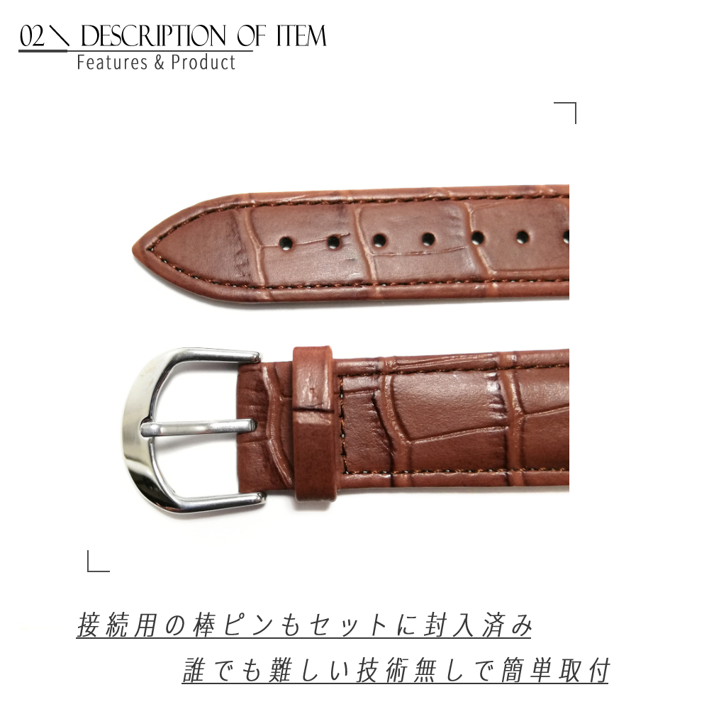 既存の時計から装着されているベルトを取り外して | こちらの革ベルトを取り付けて下さい。 取付の際の棒ピンは取り付けられていたピンも 付属のものでもどちらでも使用可能です。