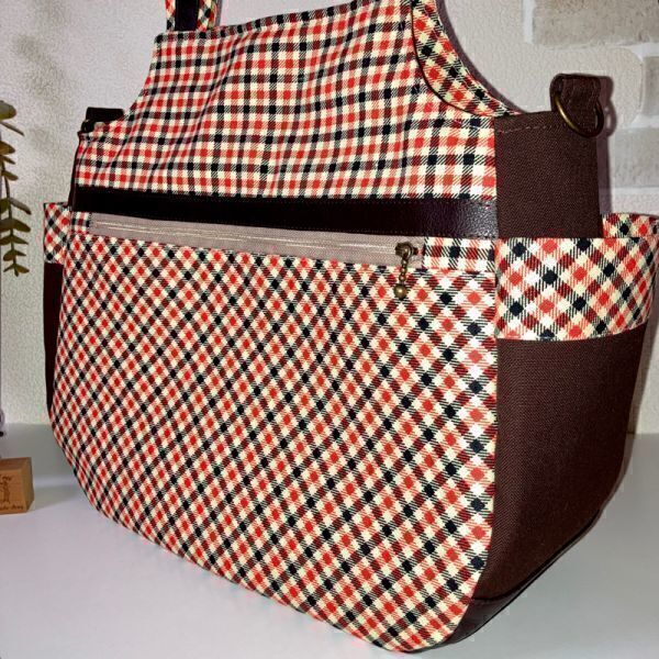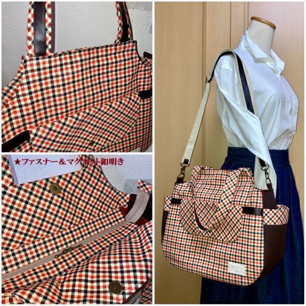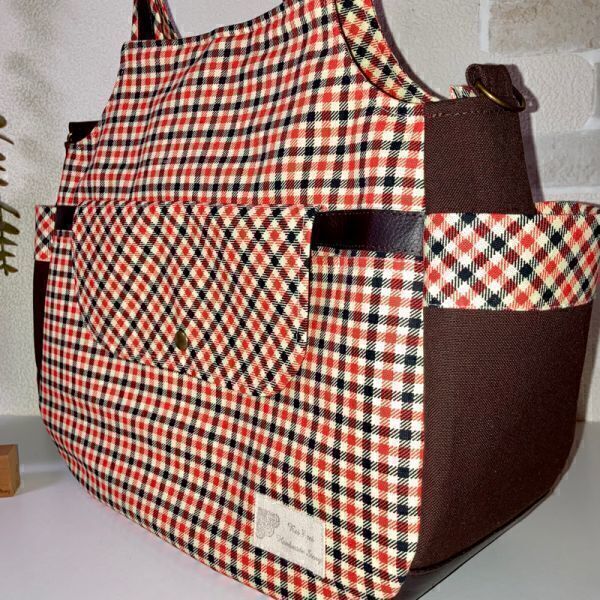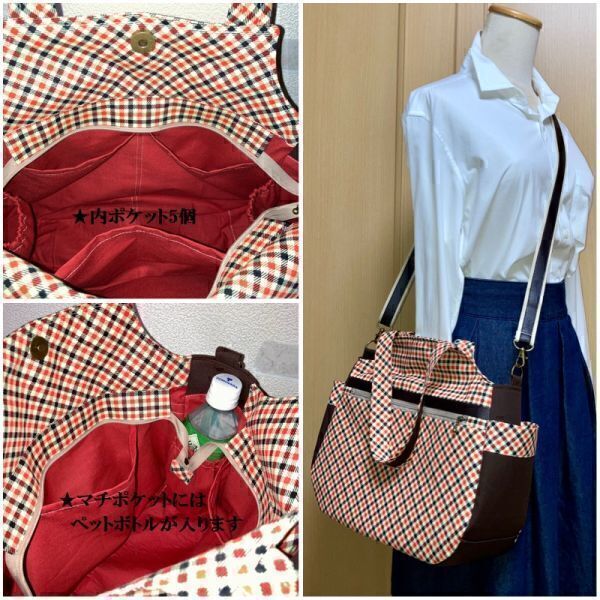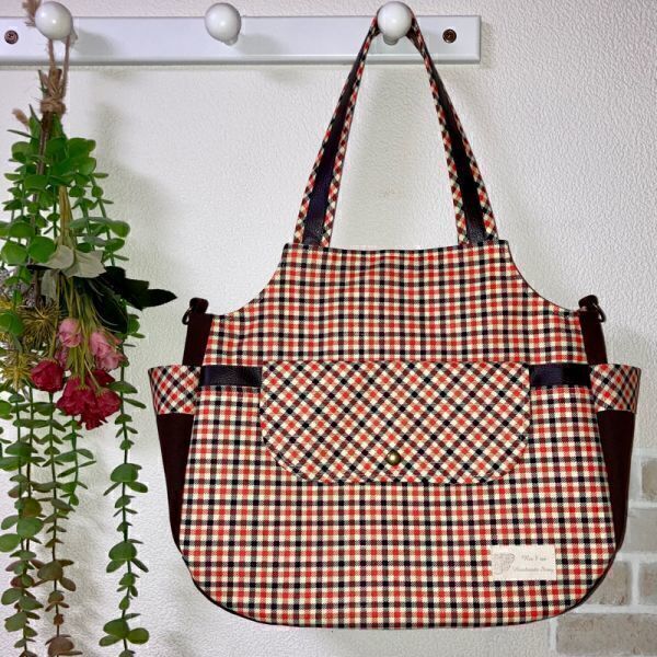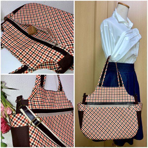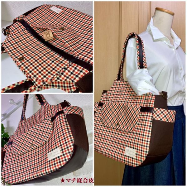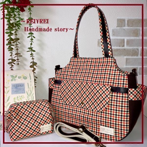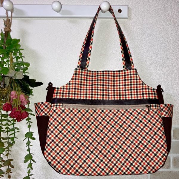 《 れい¥れいのハンドメイド生活 》 ◇ご覧いただきありがとうございます◇ ☆丸型トートバッグ&ぱっくりポーチ☆4WAY☆チェック柄☆帆布 《 トートバッグ 》 チェック柄と濃茶帆布と合皮の組み合わせの丸型トートバッグです 表マチ底に合皮を使用してますのでお手入れが簡単です ポケットいっぱいで内マチポケットにはペットボトルも入ります ファスナーとマグネット釦の2重開閉で 防犯面も安心です 横上部38㎝ たて中央31㎝ マチ底12㎝ 持ち手44㎝ 外ポケット4個 内ポケット5個 両開きファスナー&マグネット釦の2重開閉明き バッグ本体の重さ約400g ★斜め掛けショルダー紐付き 《 ぱっくりポーチ 》 口金15㎝×5㎝ たて14㎝ マチ底10㎝ ポーチ本体の重さ約75g 《 素材 》 ☆チェック柄地 綿100% ☆表無地 合皮(帆布) ☆内布 綿100% ☆表マチ底・持ち手・その他 合皮(濃茶) 《 お支払い方法 》