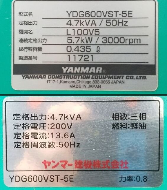 | 商品説明 | (1円スタート!) (美品) YANMAR ヤンマー ディーゼル発電機 YDG600VST-5E 定格周波数50Hz ※アワー不明 動作良好 A4545[21-1-1-A]:923065 | ||||||||||||||||||||||