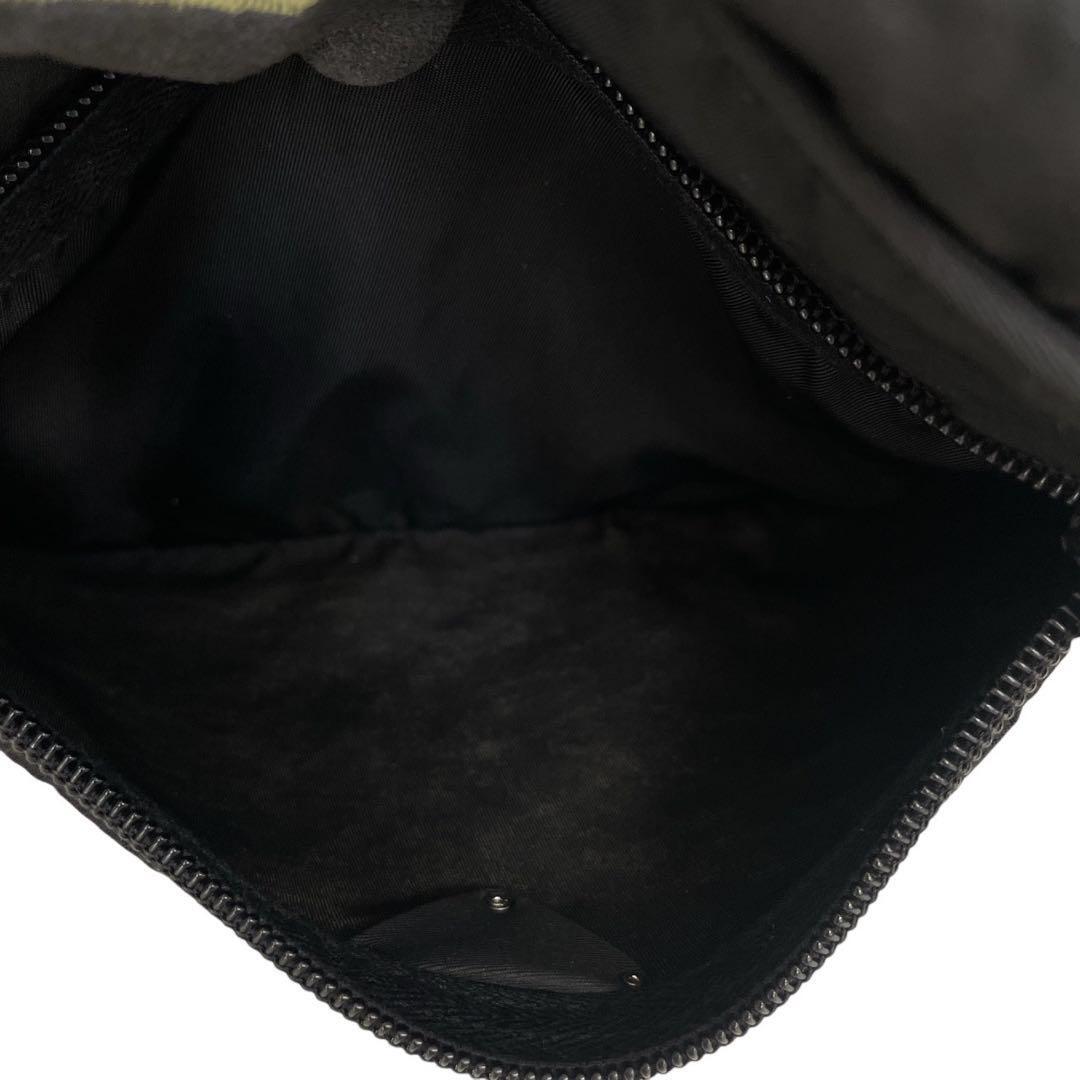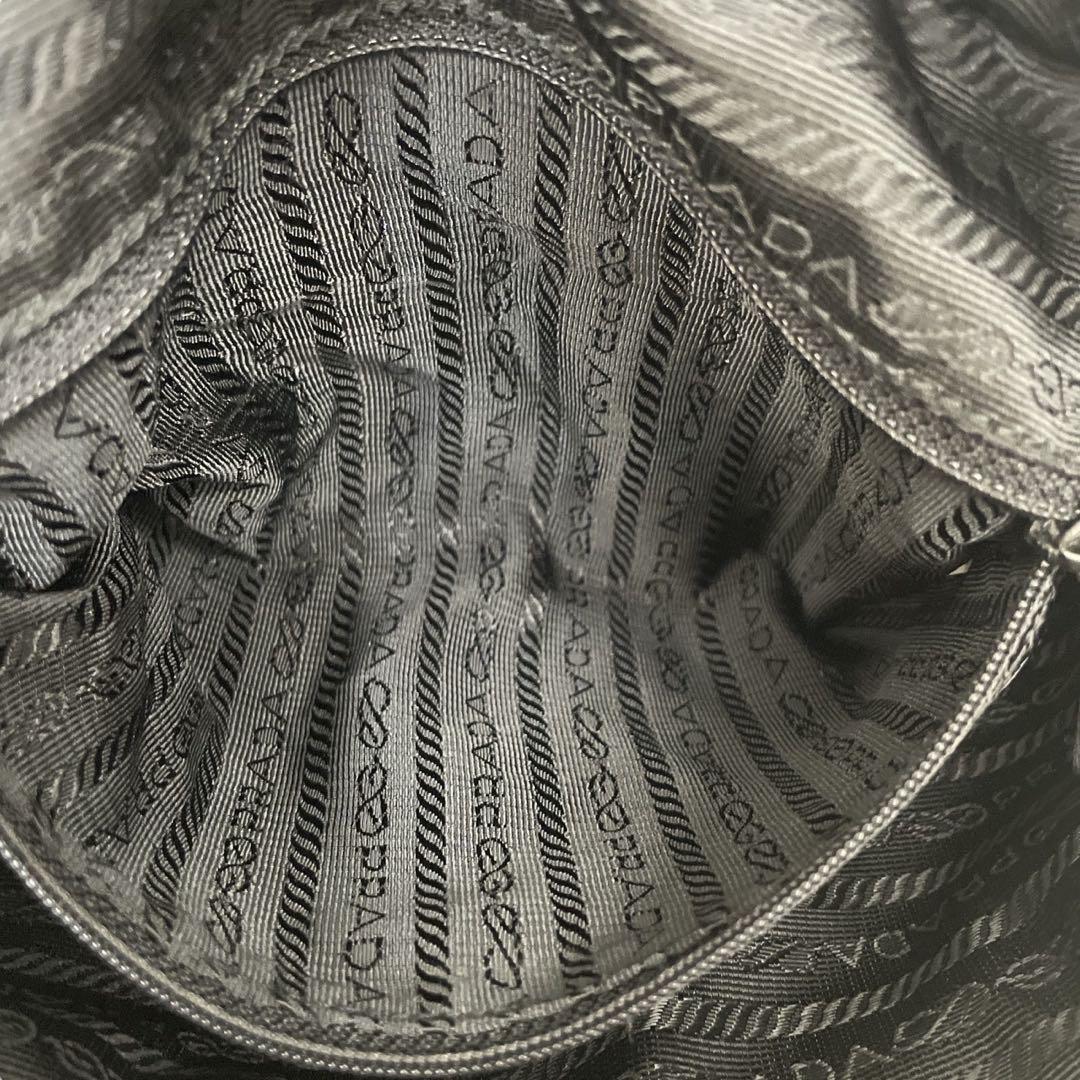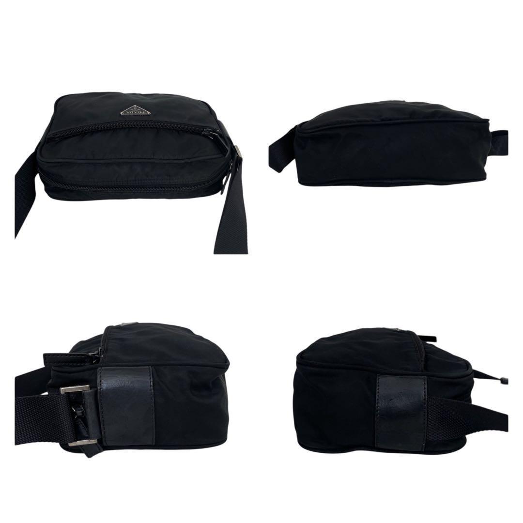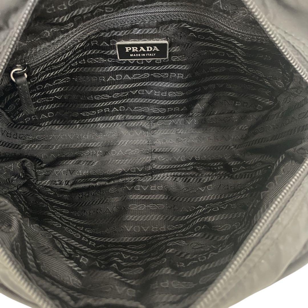 ブランドを象徴するトライアングルロゴがフロントに際立ち、シンプルなブラックナイロンにモードな存在感を添えています。