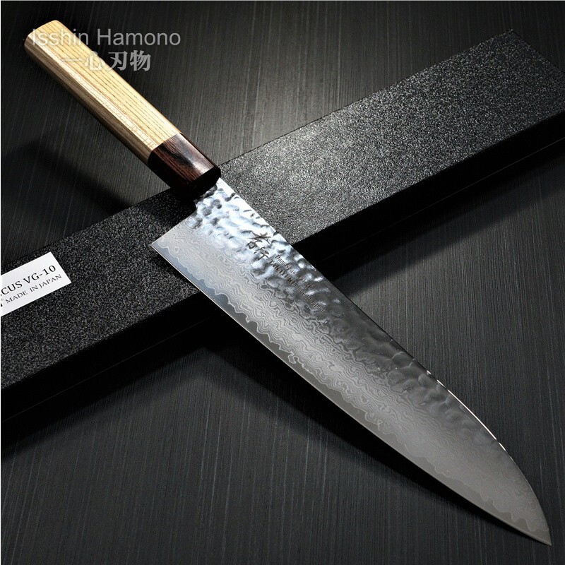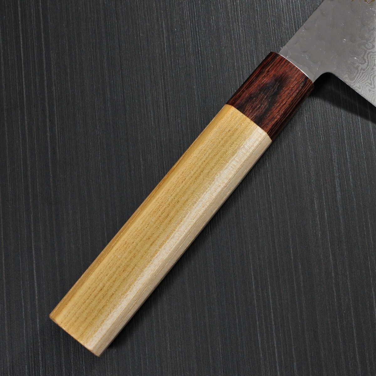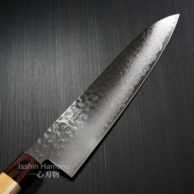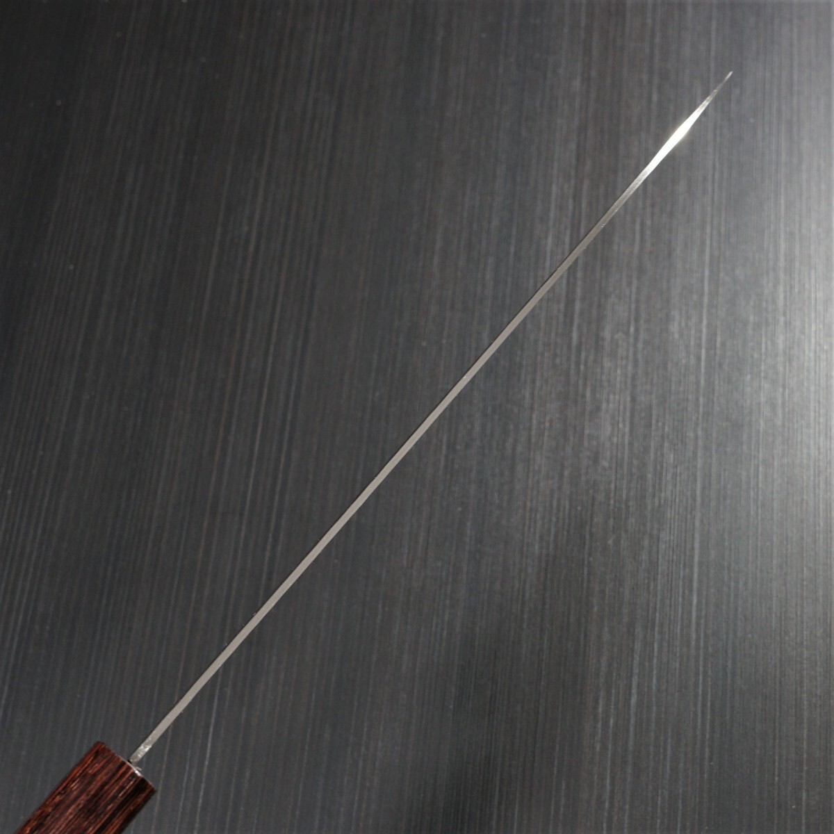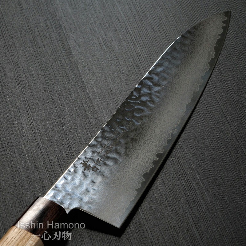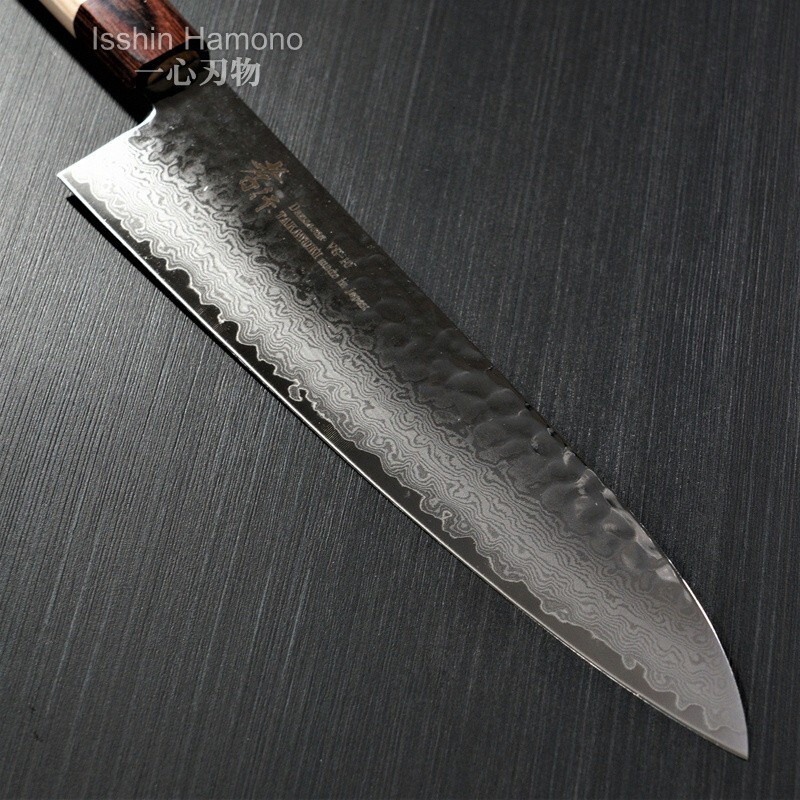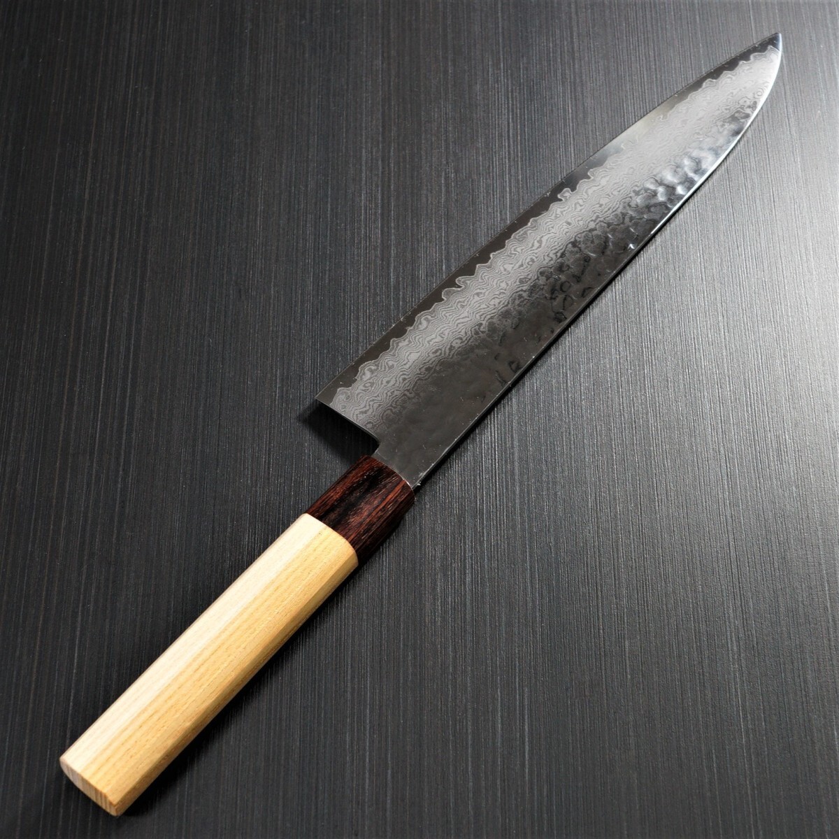 心材の刃はV金10号が使用されています。一般的にモリブデン鋼・モリブデン・バナジウム鋼・特殊鋼・硬質ステンレス・特殊ステンレスと記載されているものよりも高級な材質です。この材質はモリブデン、バナジウムだけでなくコバルトも含まれており、耐摩耗性、靭性、硬度の点で刃物鋼としての最適な条件を備えた高級ステンレス刃物鋼で、プロも使用しています。ステンレスですので、ステンレスではない包丁のように錆を気にする必要がありません。モリブデンとバナジウムが添加された医療用メスがよく切れるのはよく知られていますが、さらにコバルトが添加されているため鋭い切れ味がさらに持続します。つまり研ぐ回数を減らしてくれますので、メンテナンスが容易です。また槌目仕様は食材の切離れを良くしますので、お料理がスムーズに運びます。