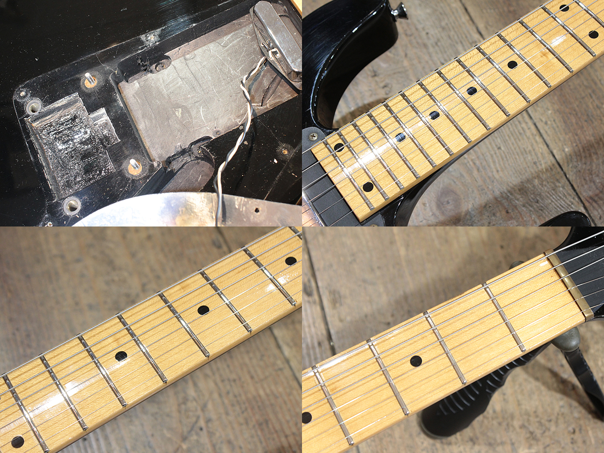 ピックガードを外すと、ブリッジ下にザグリがあります。塗装されているので、ザグリ途中でチューンOマチック仕様に変更し、出荷されたものと思われます。キズや打痕はそれなりにあり、黒色ということもあってやや目立つ感じか。ペグは交換されており、交換痕が残っております。オーダーしてからも、理想の一本になるよう何度かアップグレードを経てきた様相です。