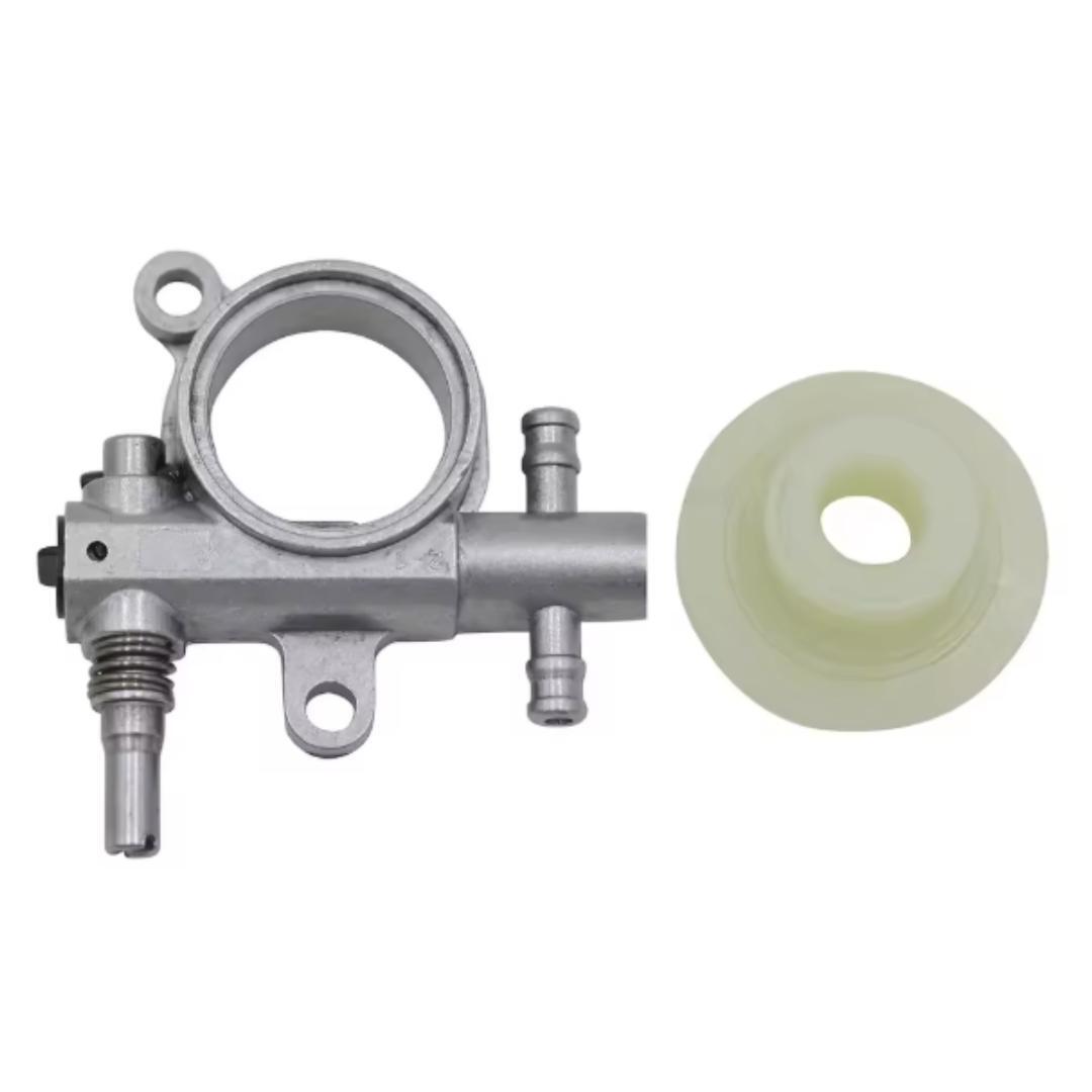 G250AV 2501 2550 3200 3201 334 3401 3500 3501 3650の、オイルポンプとウォームギアのセットです。ソーチェンの潤滑は、安全で効率的な切断作業に不可欠です。オイルの出が悪くなると、ガイドバーとソーチェンの摩耗が急激に進行し、最終的には焼き付きを起こして高価な部品の交換が必要になります。