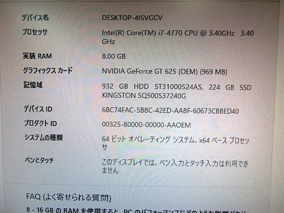 ディススクトップPC DELL inspiron3847 D16M Core i7 4770 3.4G/8G/SSD240G + HDD1T Win10です。