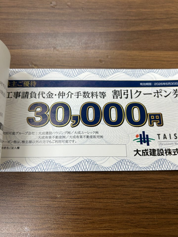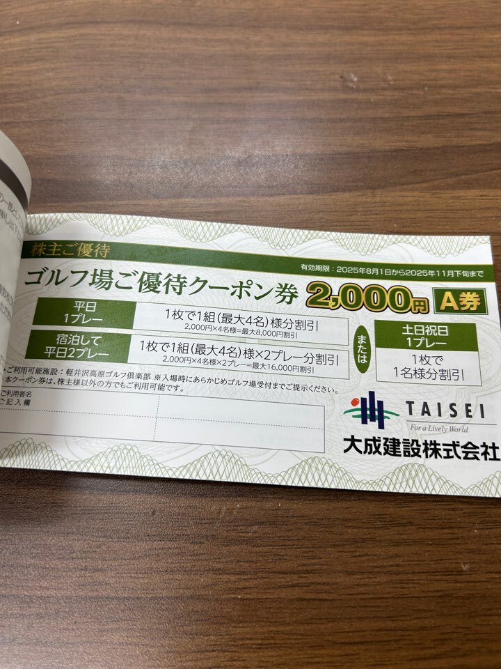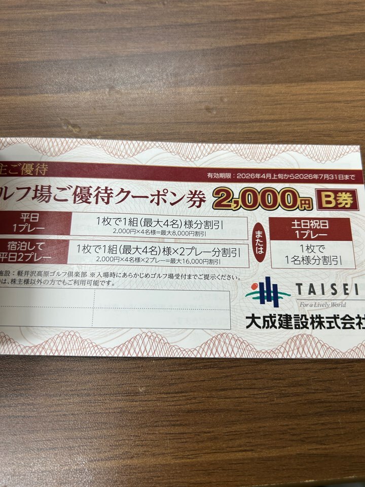 大成建設の優待券です。 工事請負代金・仲介手数料等割引クーポン30000円×3枚 (26年6月30日まで) ゴルフ場(軽井沢高原ゴルフ楽部)優待クーポン券2000円x2枚 (2025年8月1日から2025年11月下旬までと 2026年4月上旬から7月31日までの1枚ずつ)