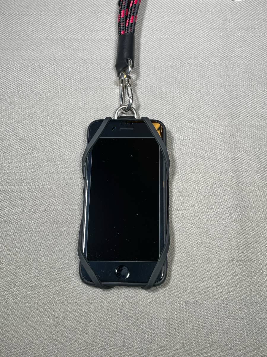シリコン部分の大きさは約13cm×7.3cm、ストラップの長さは金具含め約104cmです。