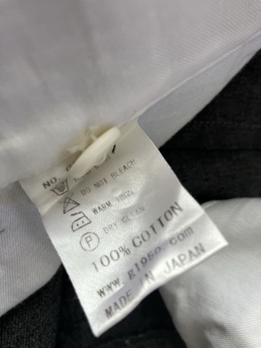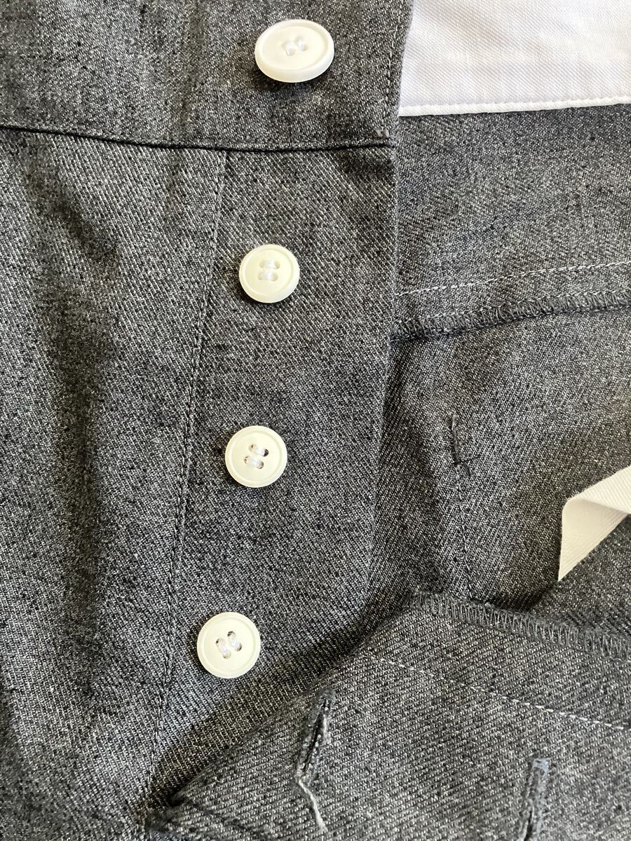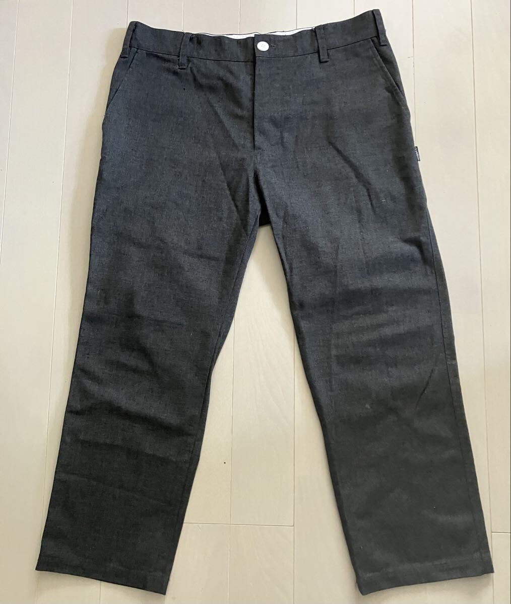 しっかりした厚手の素材感に白のボタンが映える一本です。素人採寸ですが、ウエスト94cm、股上30cm、ワタリ29cm、股下66cm、裾幅21cmです。