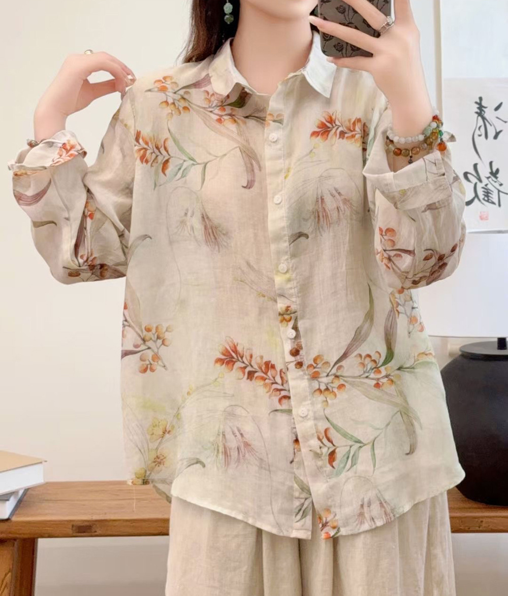 新作プリント花柄 フリーサイズ ワイシャツ チュニック トップス 麻100% 大人可愛 ナチュラル 花柄