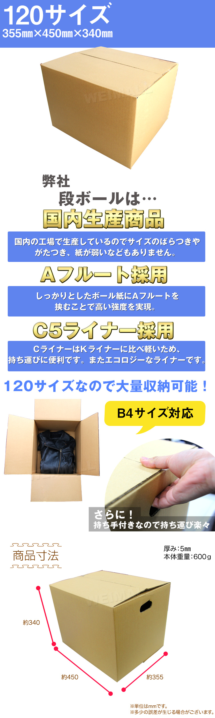 宅配サイズ: 120サイズ サイズ(約): 幅450mm×奥行350mm×高さ340mm 厚さ(約): 5mm(Wフルート) 重さ(約): 822g 材質強度: 180g |