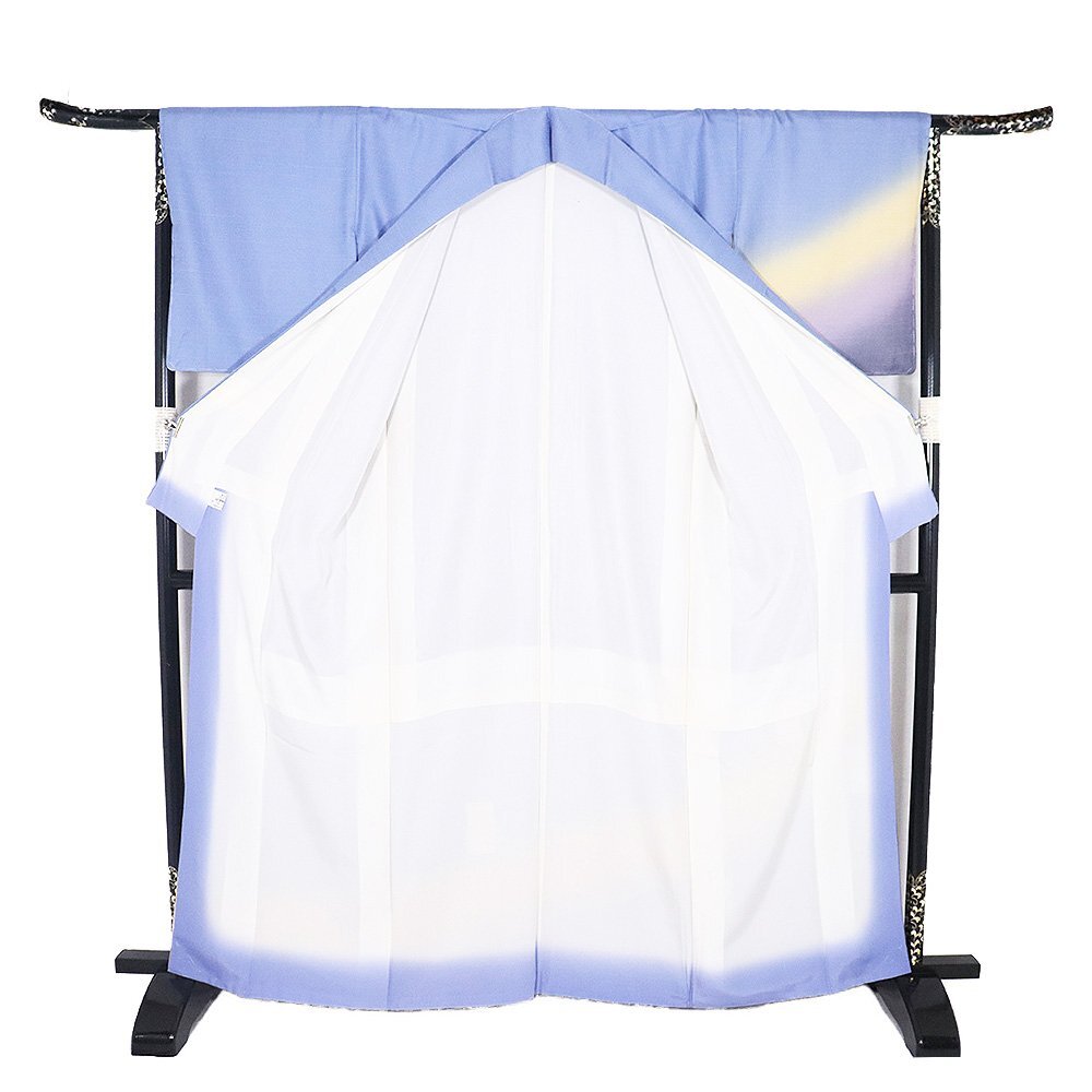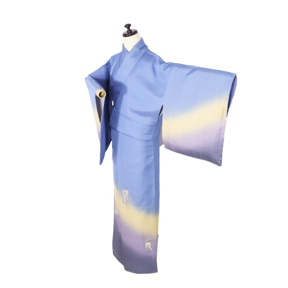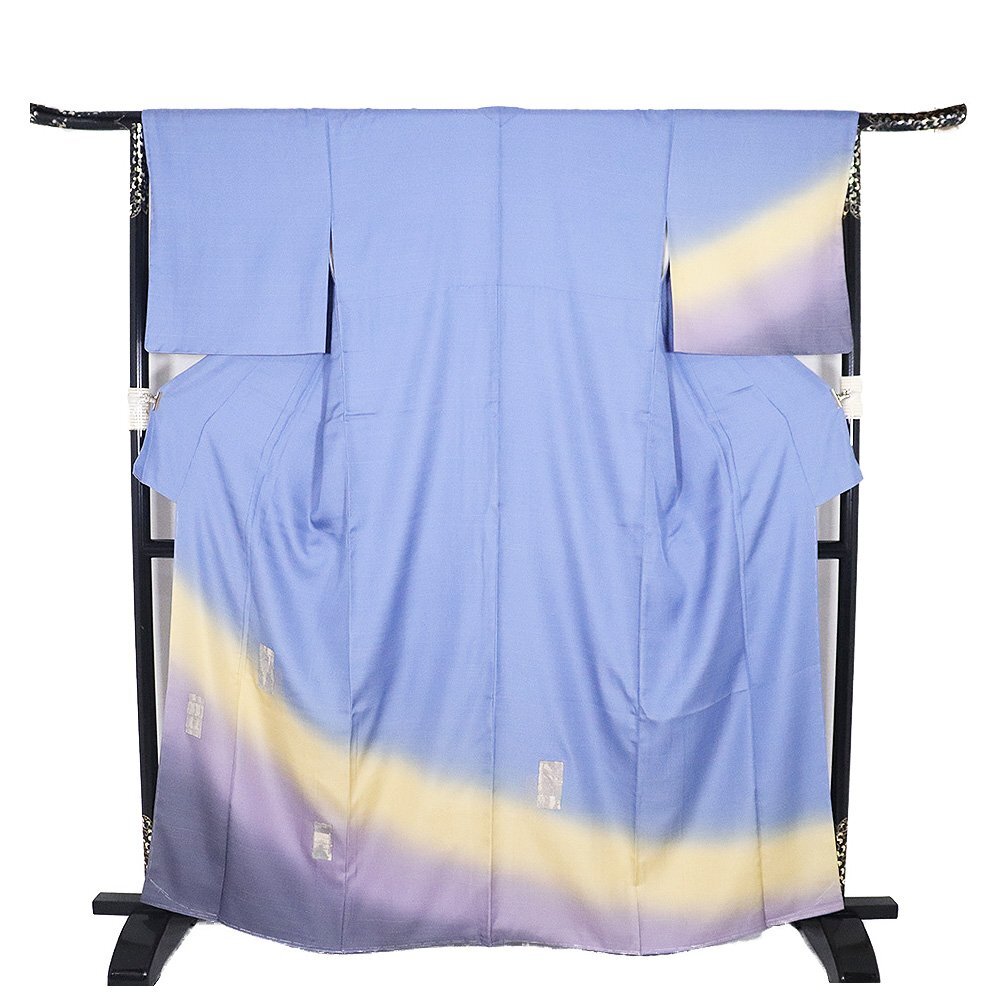 | 訪問着 袷 丹後縮緬地 青(群青色)・クリーム(蜂蜜色)・紫(竜胆色)・ 緑(藍鉄色)・小縞・横縞地 摺り加工・短冊・樹木・金糸 170 広襟 未使用品 仕付け付き | |
