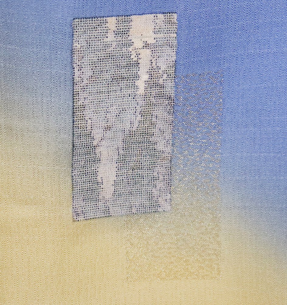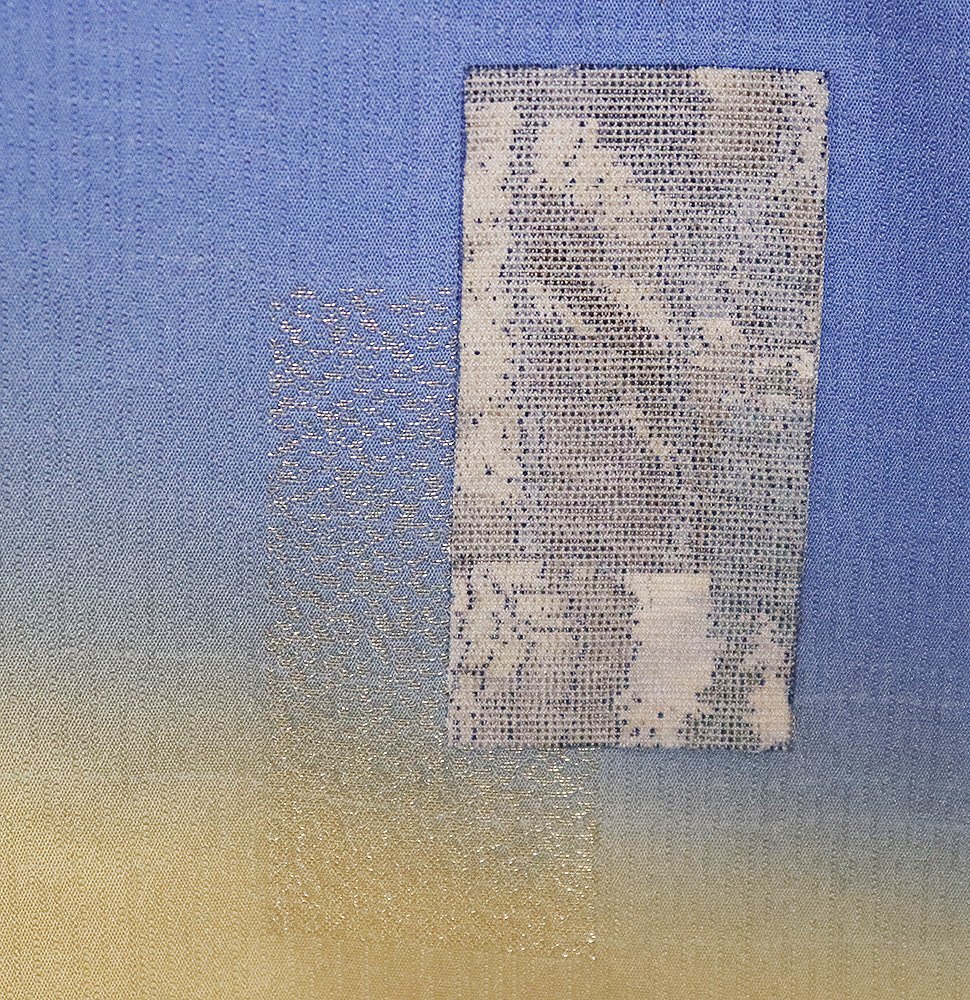 | 色・柄 | 訪問着 袷 丹後縮緬地 青(群青色)・クリーム(蜂蜜色)・紫(竜胆色)・ 緑(藍鉄色)・小縞・横縞地 摺り加工・短冊・樹木・金糸 (写真では上手く色が出ない場合があります。ご了承下さい) |