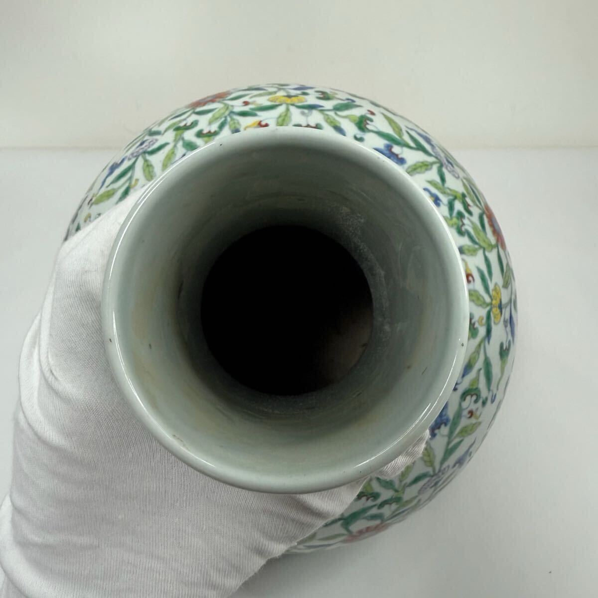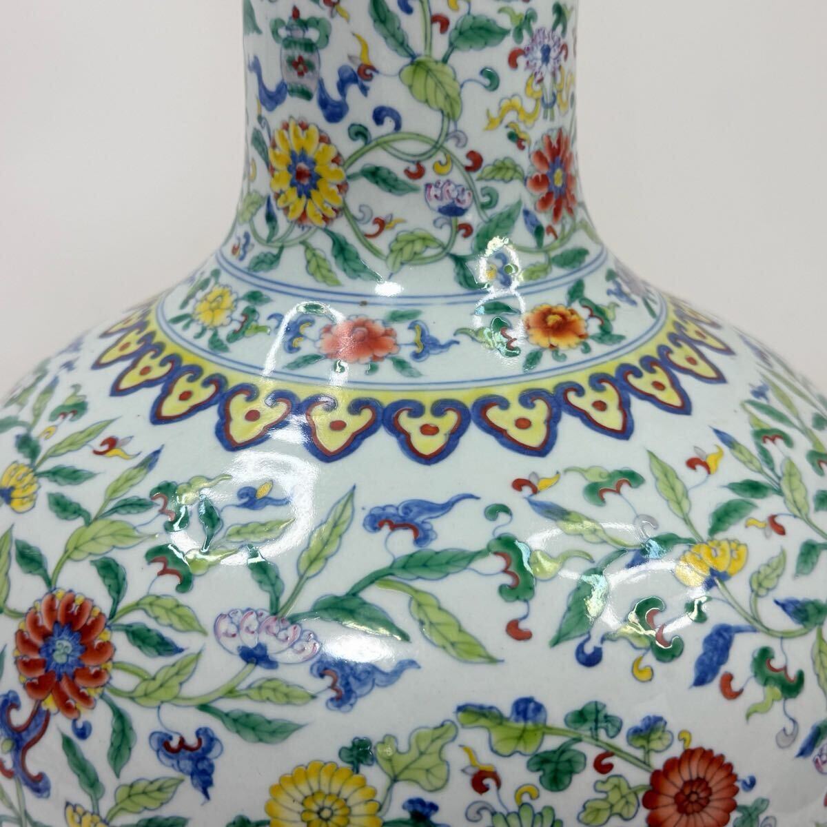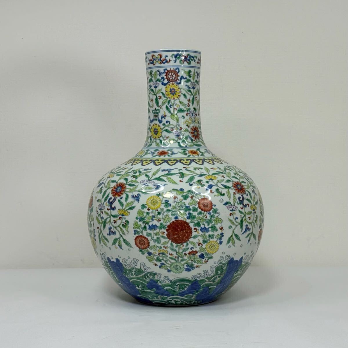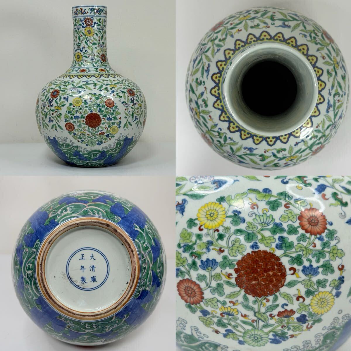 | CB6-中国古美術 時代物 花瓶 花器 花生 花入 天球瓶 色絵 花草図 在銘 大清雍正年製 唐物 陶磁器 中国古玩 骨董品 幅29cm 高さ40cm |
