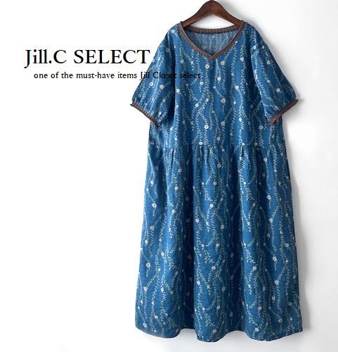 ナチュラル素材の総柄ワンピース。ウエスト切替部のギャザーでふんわりシルエットを演出。Vネックでお顔周りをすっきり魅せ・両サイドにシームポケット付き。カーディガンのインナーにも最適です。軽量でお洗濯後の乾き良くデイリーにお出かけに大活用頂けます♪