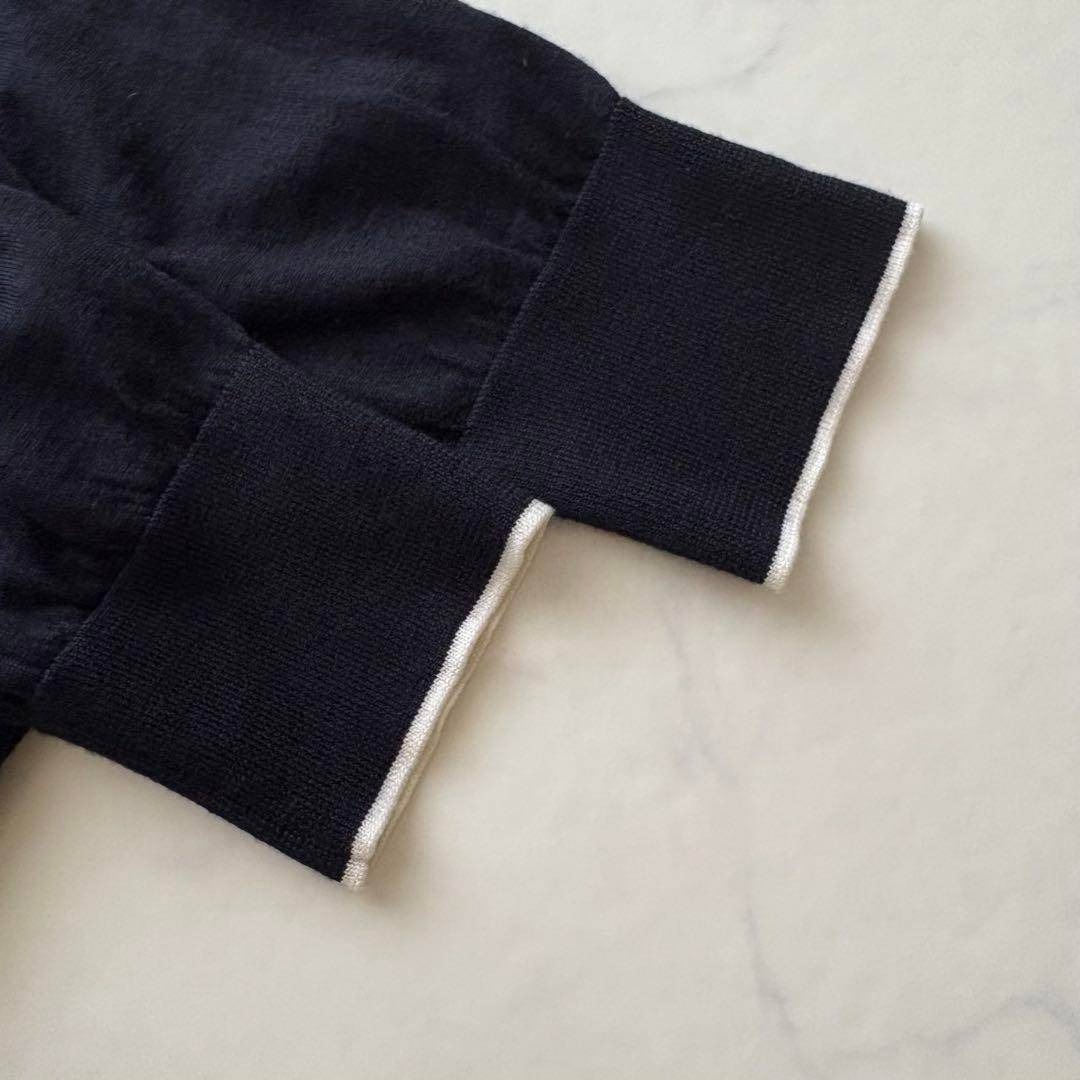 ・襟ぐり・袖口のホワイトラインが程よい抜け感を演出し、シンプルながら華やかさのある一枚。
