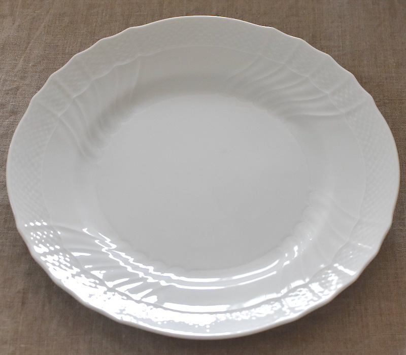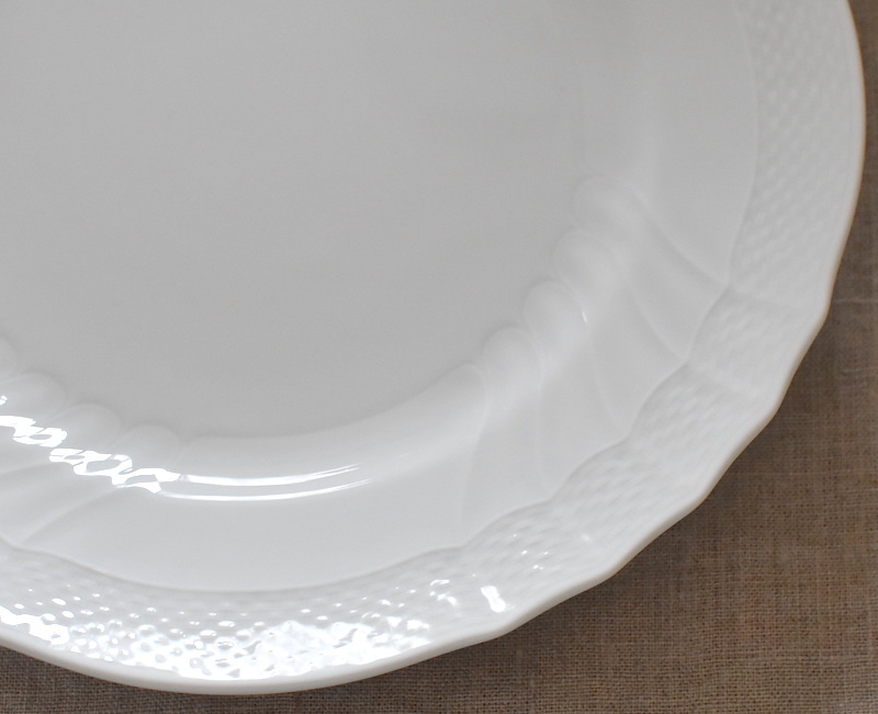 リチャードジノリ ベッキオの25cmプレート。「ベッキオ」はイタリア語で「古い」の意味。18世紀に誕生した最古のシェイプのひとつで、バロック様式の格調高いレリーフが特徴です。白磁の代名詞とされるベッキオジノリホワイトは、アイテムのバリエーションも豊富で、シーンや食材を選ばず、日常からおもてなしまで対応できます。