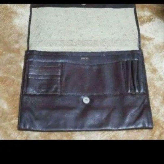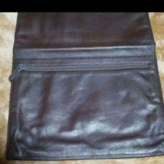 ダークブラウンのレザー製クラッチバッグ、シンプルで洗練されたデザイン。