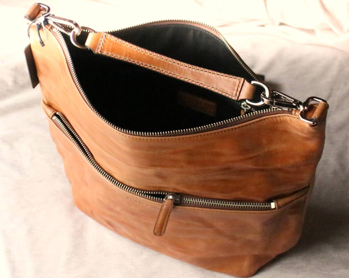 素材はもちろん同ブランドの定番レザーとして人気を誇るRODI(ローディ)を使用。手作業によるイレギュラーな皺加工の風合いと、幾重にも重ねられたハンドペイントが生む奥行きのある色あいが独特な雰囲気を演出します。外と内にジップ付きポケットが付いており、コンパクトながら使い勝手は良好です。ストラップを外してクラッチバッグとしても使えます。