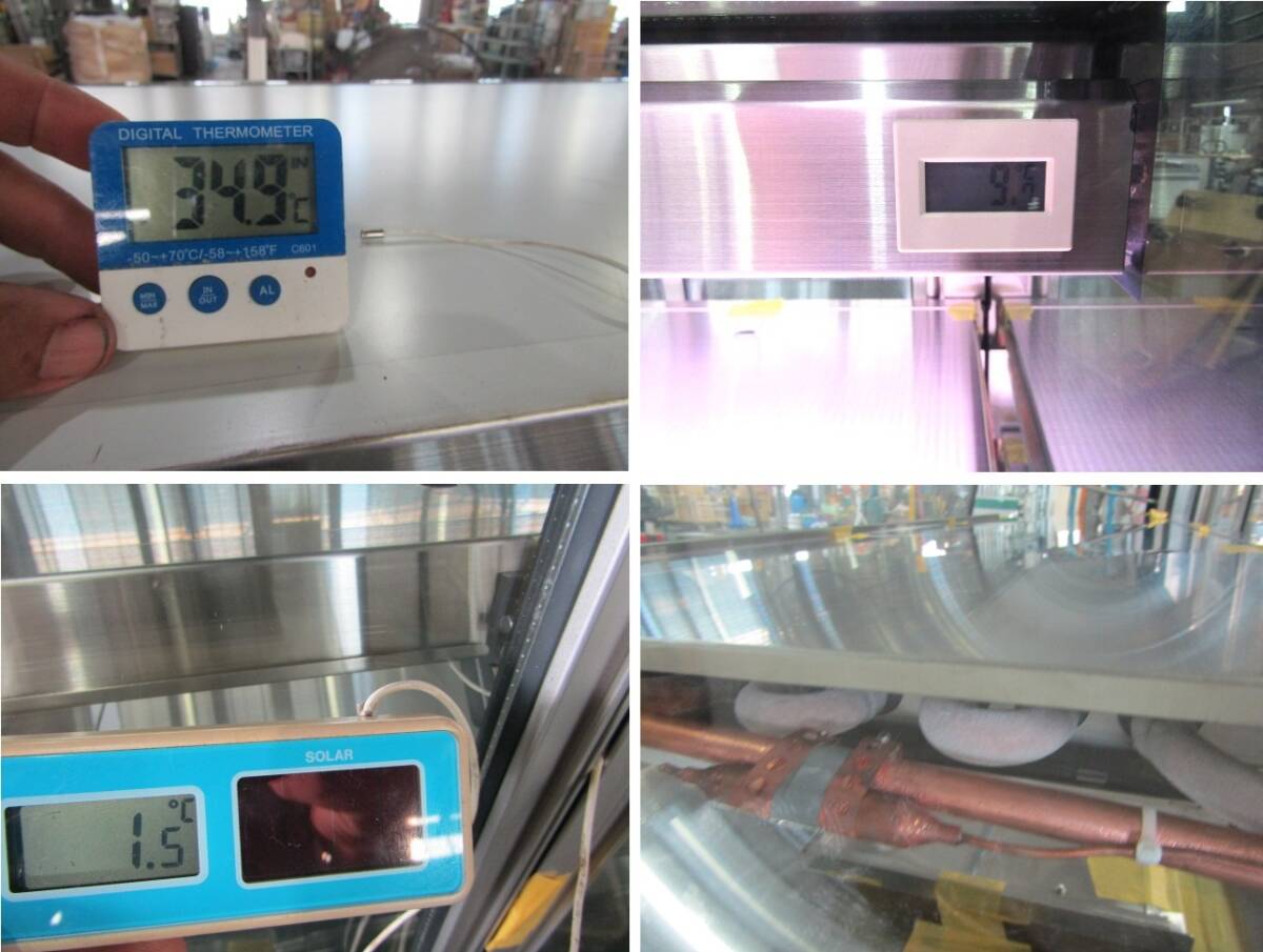 連日の猛暑のなか35度近い冷房のない倉庫で、3時間ほど稼働させて庫内表示は9℃程度、銅管の配管付近は1.3度、冷えて霜がついているのは確認しました。写真参考にしてください。