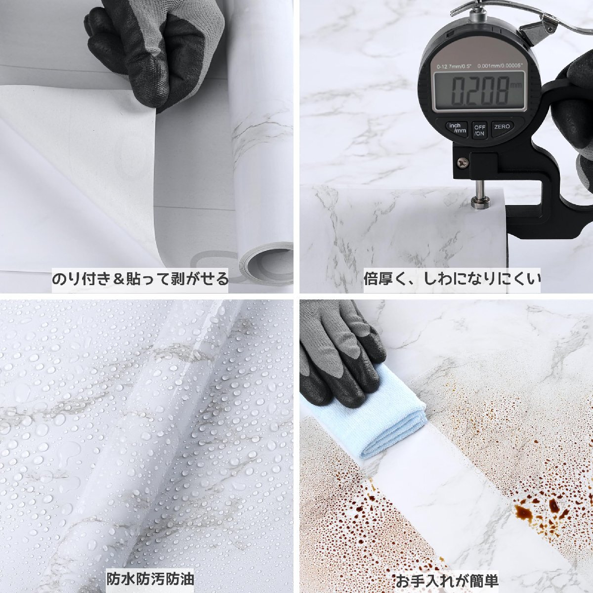 【商品仕様】素材:高品質PVC/大理石柄/光沢ツヤあり/白・グレー/サイズ:40cm×1000cm/4平方メートル/厚み:約0.27mm(厚手)【特徴】防水・防湿・防カビ、よりシワ・気泡が入りにくい、下地が透けることもなく、耐摩耗性や耐久性にも優れています。掃除はサッとひと拭き、床に貼れば床掃除も楽ちんです。
