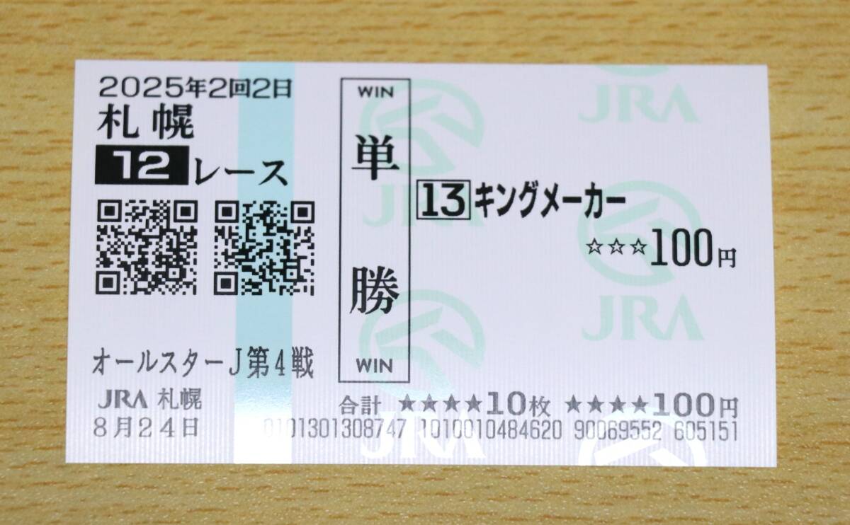 キングメーカー 札幌 12R 2025 ワールドオールスタージョッキーズ 第4戦 (2025年8/24) 現地単勝馬券(札幌競馬場)です。気に入って頂けた方の落札を心よりお待ちしております。 商品は定型郵便(110円)又は又はゆうパケットポストminiで発送となります。 厚さの関係上、定型郵便の場合は片面段ボール補強、ゆうパケットポストの場合は両面段ボール補強となります。どうかよろしくお願い致します。