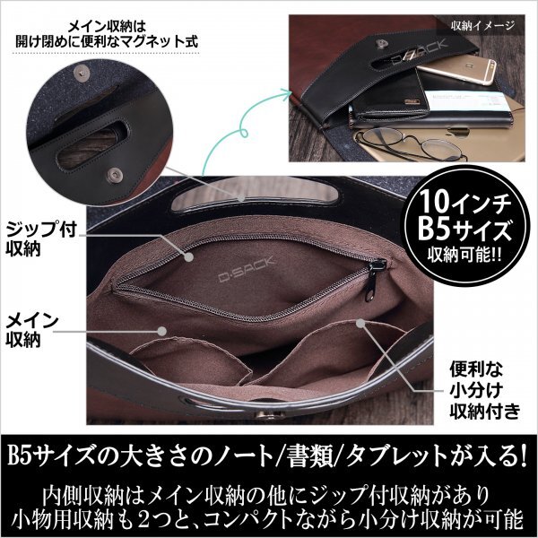 薄めのハンドバッグなのでたくさんの荷物は入れられないものの、B5サイズの大きさのノートや書類、10インチタブレットがぴったり入る大きさで、 内側収納にもメイン収納とジップ付収納 と小物用の収納が2つついておりコンパクトながら小分け収納が可能なので利便性も高いです。