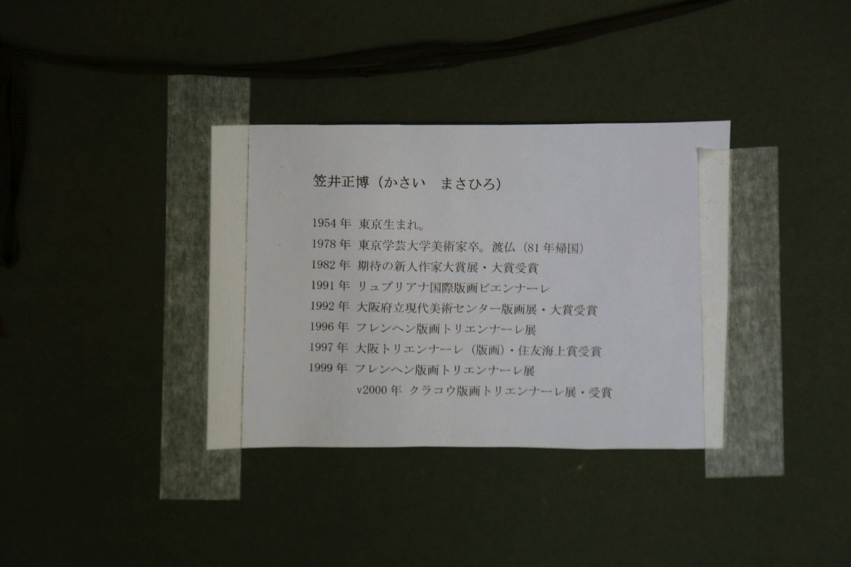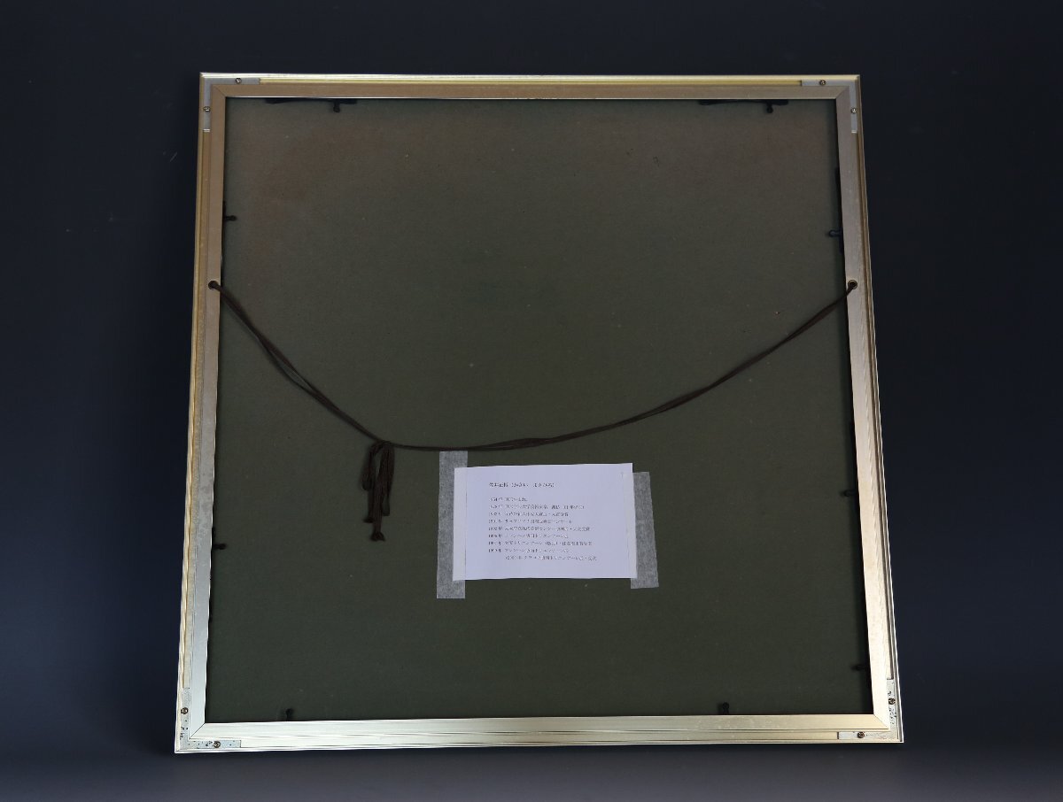 笠井正博:1954年東京生まれ。東京学芸大学在学中は、小学校の美術教員を目指していた。卒業間近に井上公三に影響をうけ東京学芸大学卒業後にフランスに渡り、井上公三のもとでセリグラフや壁画を、フランス・パリ・ボザールでリトグラフを学ぶ。1981年に帰国すると、銀座ギャラリー手、名古屋ギャルリーユマニテ、銀座養清堂画廊、広島ギャラリーたむら、大阪ギャラリープチフォルム等で個展を開催。高知県安芸市のタマイホテル、広島県広島市の広島センチュリーホテル、愛知県名古屋市の布池教会、愛知県春日井市の春日井市文化センター、東京都の芝パークホテルなどの壁画を手掛ける。ポーランド・クラクフ版画トリエンナーレ、スロベニア・リュブリアナ版画ビエンナーレ、クロアチア・スプリト版画ビエンナーレなど国内外のコンペに出品・受賞。作品はパリ国立図書館(フランス国立図書館のことか?)、大阪現代美術館(館名は正確に記載せよ)などに収蔵されている。 シルクスクリーンを主に、ガラス絵、水彩などの作品がある。 経年ありますが状態良好です。縦60cm、横60cm。ノークレーム、ノーリターンでお願い致します。この他にも出品しておりますのでご覧下さい。ここをクリック