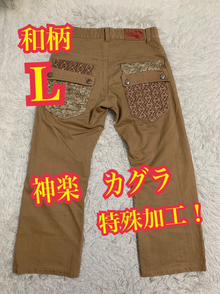 神楽 カグラ デニム ジーンズ 和柄 特殊加工 ベージュ Lサイズ