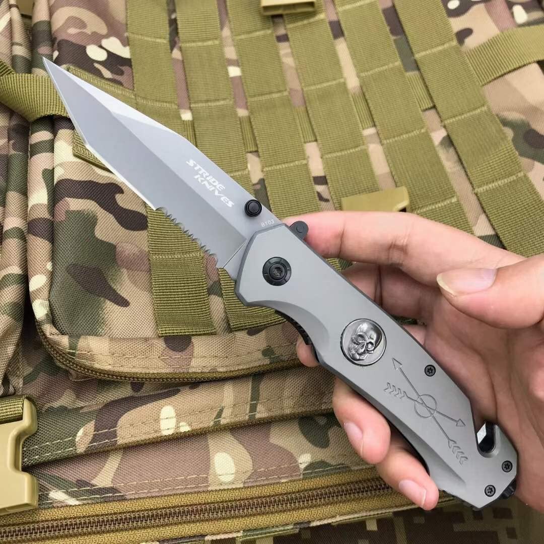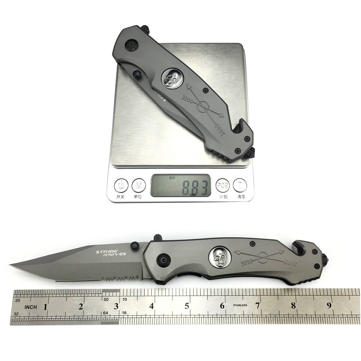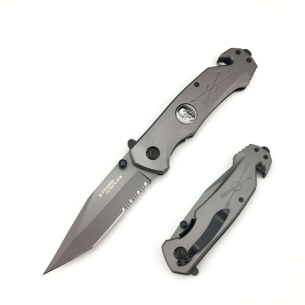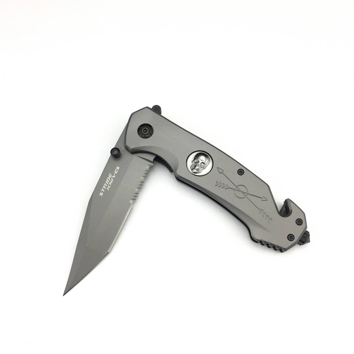 【折りたたみナイフ素材】5Cr13MoVスチールタントポイントブレードは、優れた切断性能とエッジ保持力を備え、耐久性に優れています。ステンレス鋼のハンドルは灰色のチタンコーティングで処理されています。