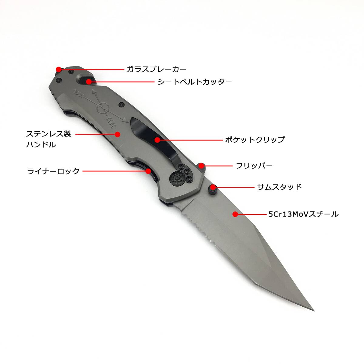 【多機能フォールディングナイフ】フリッパーは片手で素早く展開でき、ライナーロックでしっかりと固定され、ポケットに安全に収納できます。シートベルトカッターとガラスブレーカーは緊急時に役立ちます。