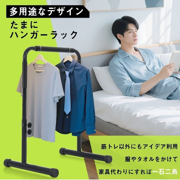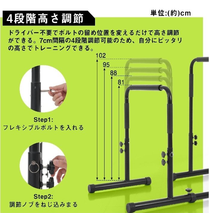 【工具不要の4段階高さ調節機能】7cm間隔で4段階にボルト位置を変えるだけで自分に最適な高さに設定でき、プルアップからディップスまで自在に対応します。