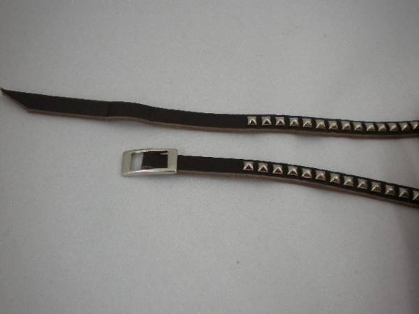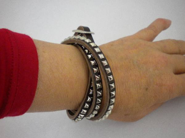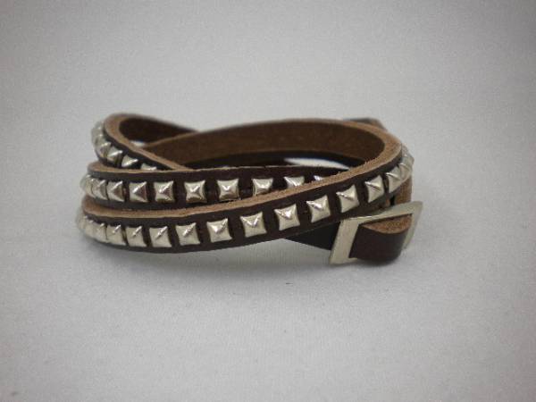 ★牛革3重巻気ブレスです。★シルバーカラーの小さなピラミッドスタッズがズラーっと並んでいます。★全長64cmです。2重巻にしてアンクレットでもOK★新品ですが展示品でしたので、多少の汚れは了承ください。