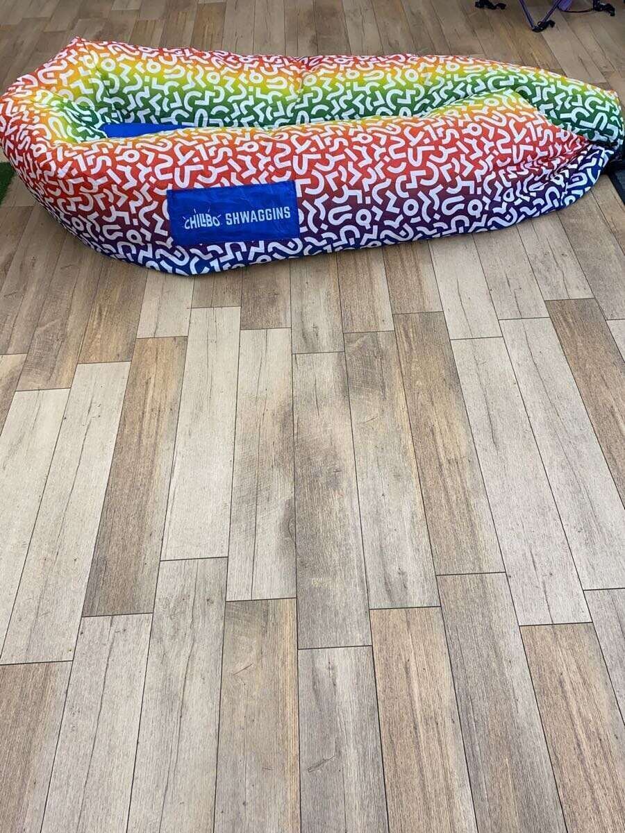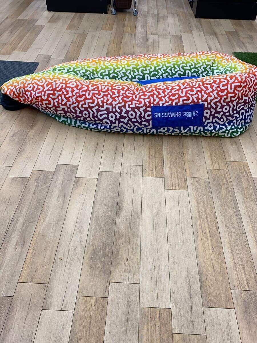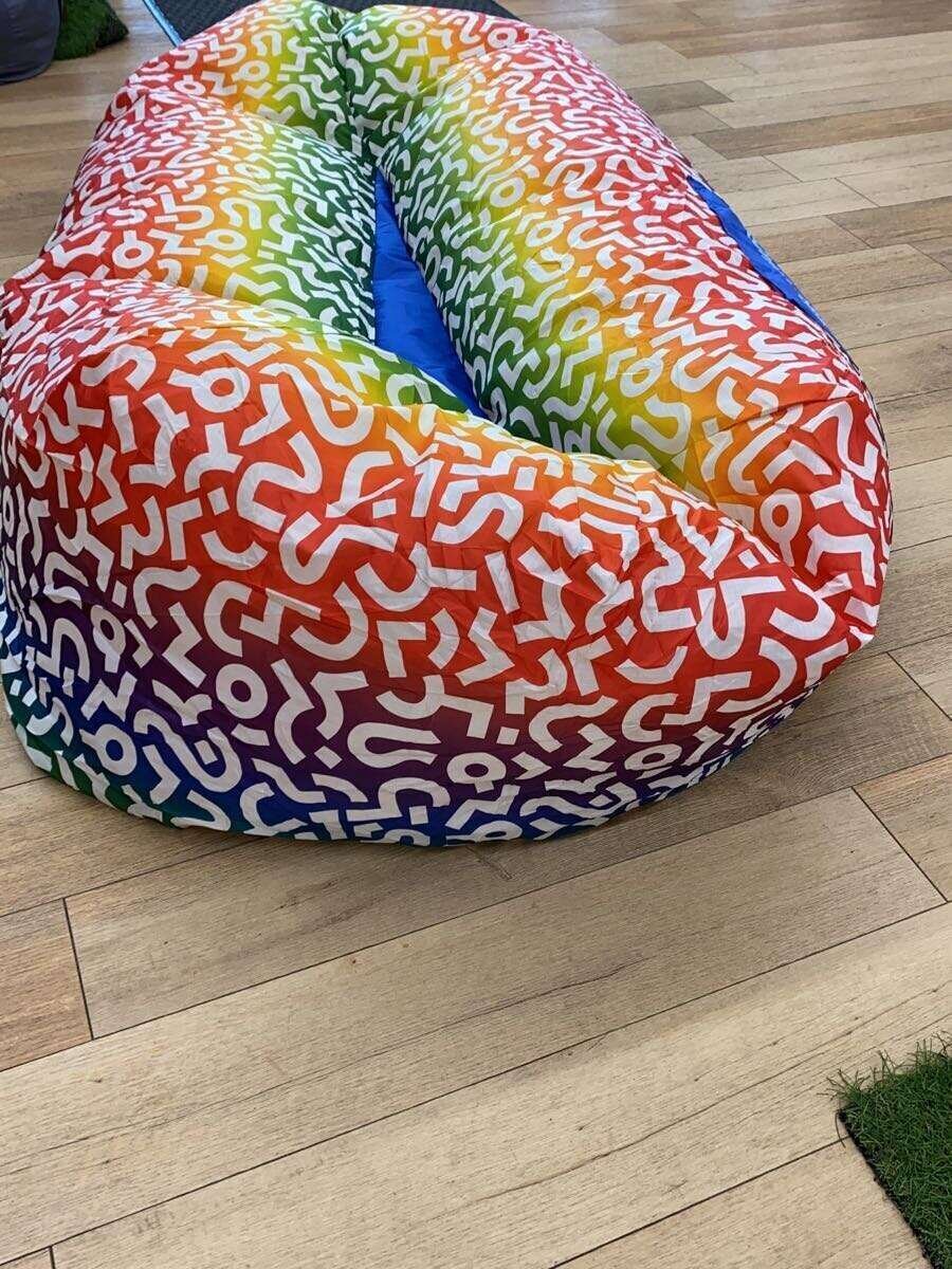 全体的に細かい汚れがございます。 エアー取り込み口(ビニール部分)の一部に 小さな破れがございます。 付属品:ソファー本体 ペグ 取扱説明書 |