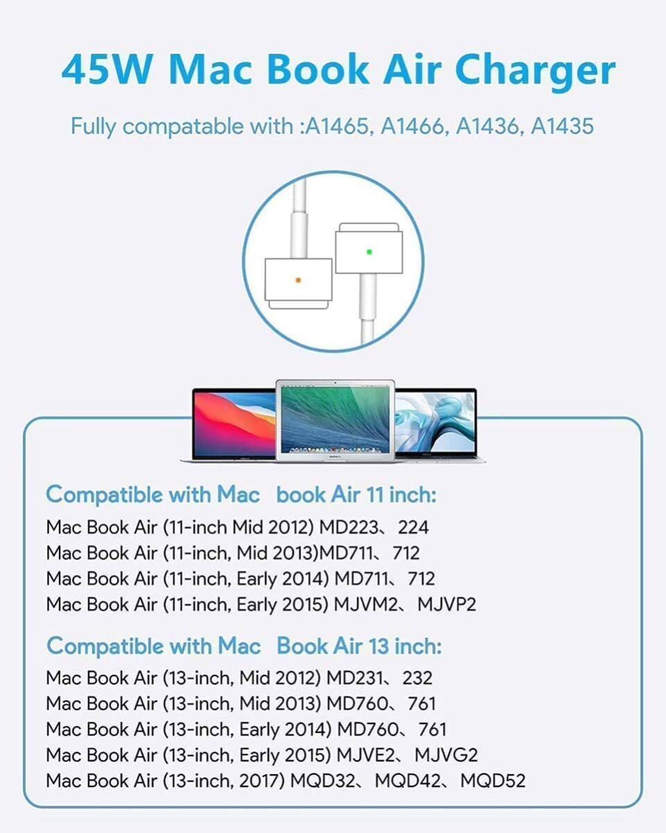 【Macbook Air互換用の電源アダプタ】:Macbook Air 11 と13インチ(2012 中期以降のモデル)に適用します。MacBook Air (13インチ、2012中期); MacBook Air(11インチ、2012中期); MacBook Air(13インチ、2013中期); MacBook Air(11インチ、2013中期); MacBook Air(13インチ、2014初期); MacBook Air(11インチ、2014初期); MacBook Air(13インチ、2015初期); MacBook Air(11インチ、2015初期); MacBook Air(13インチ、2017)。モデル:A1466、A1465、A1436、A1435。