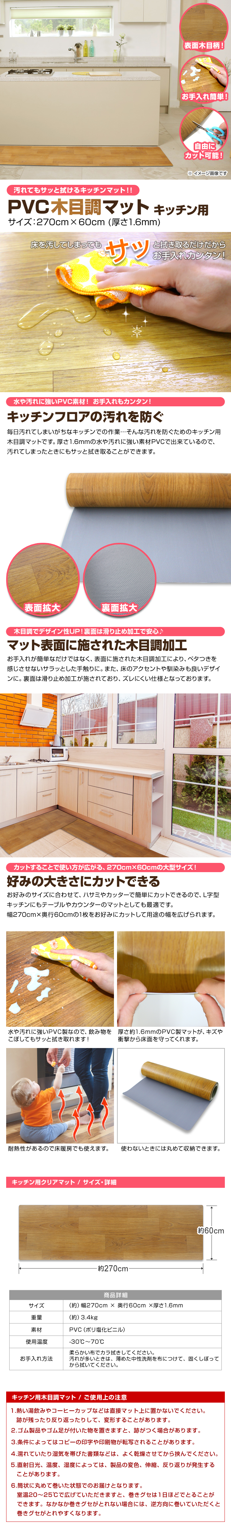 インテリアのアクセントや床に馴染みもよいデザインで、お部屋のイメージを損ねない!! 耐熱性があるので床暖房の上でも使用OK! 240cmの大型サイズで簡単にカットすることができるので、ダイニングテーブルやカウンターのマットとしても最適です! 【商品仕様】 カラー:木目調 サイズ(約):幅270cm×奥行60cm(厚さ1.6mm) 重量(約):3.4kg 材質:PVC(ポリ塩化ビニール) 使用温度(約):−30℃〜70℃ ※お手入れは薄めた中性洗剤を湿らした布につけ、固く絞って拭いた後、水分が残らないように乾いた布で乾拭きしてください。 ※日の当たる所で使用しないでください。日焼けで硬化する場合があります。 |