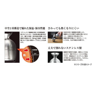| 中空2重構造で優れた保温・保冷性能。ステンレス2重構造の間に中空断熱層を設けることにより、日本酒の熱伝導が抑えられ、優れた保温・保冷性能を発揮します。燗酒や冷酒などの「飲みごろ温度」を陶器製に比べて長い時間キープすることが出来ます。さわっても熱くなりにくい。先述の中空2重構造の効果により、熱燗を入れた状態でも徳利が熱くなりにくく、お酒を注ぐ時も安心です。丈夫で割れないステンレス製。 |
