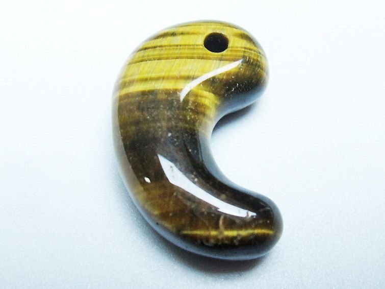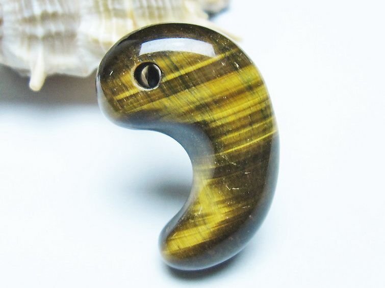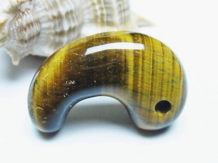 ■商品名: タイガーアイ※黄虎目石勾玉 ■商品ID: T356-1685 ■商品重量:約 8g ■商品サイズ: 高約:29mm 横約:19mm 厚約:10mm 【タイガーアイ(虎目石)】 タイガーアイは角閃石の一種のクロシドライト(青石綿)に石英が染み込んで酸化し、茶色や黄金色になったものです。 研磨すると光の当たり具合によってキャッツアイ効果、またはシャトヤンシー効果と呼ばれる猫の目のような光の筋が見られ、その輝きと黄金色と褐色の縞模様が虎の眼に見えることからこの名前が付けられました。 ベーシックな金茶色の他にも様々な色合いがあり、温度が高い環境で生成されると深い赤みを帯びたレッドタイガーアイになります。 この他にクロシドライトが酸化せずに生成された灰色のグレータイガーアイは「ウルフズアイ(狼目石)」、濃青色をしたブルータイガーアイは「ホークアイ(鷹目石)」と呼ばれ、タイガーアイとは区別される場合があります。 タイガーアイは視野を広げ正しい判断力と行動力で成功へ導くとされ、ルチルクォーツに匹敵するほどの金運・仕事運アップストーンとして高い知名度と人気を誇っています。 また男性イメージの強い石ではありますが、強力な邪気払い・トラブル回避の効果も持ち合わせていますので女性にはストーカーやセクハラ対策のお守りとしても有用です。 ⇒ タイガーアイをもっと詳しく ◆ワンポイント情報 タイガーアイは塩分によって劣化しやすいので汗が付いた場合は柔らかい布で拭き取るようにし、塩を用いた浄化は行わないように注意しましょう。 |