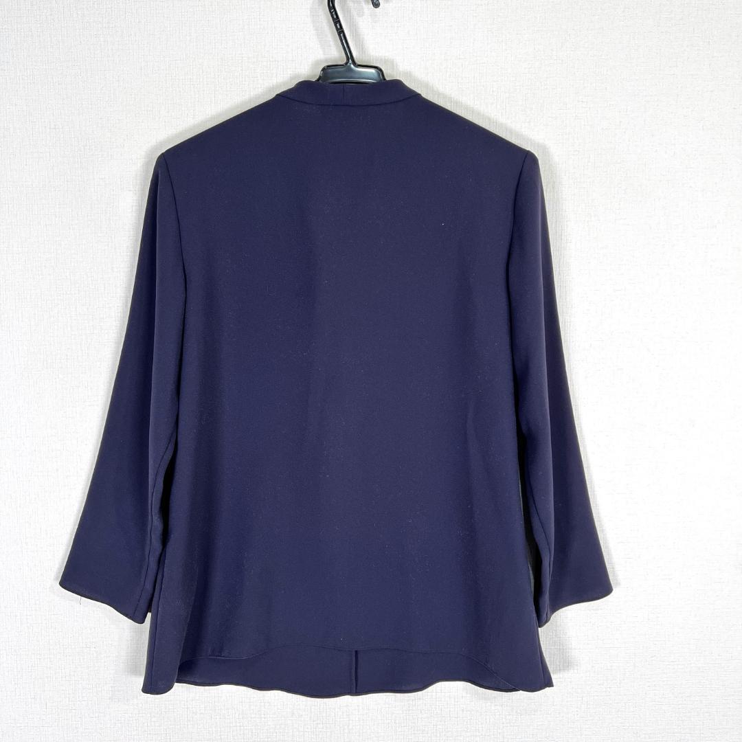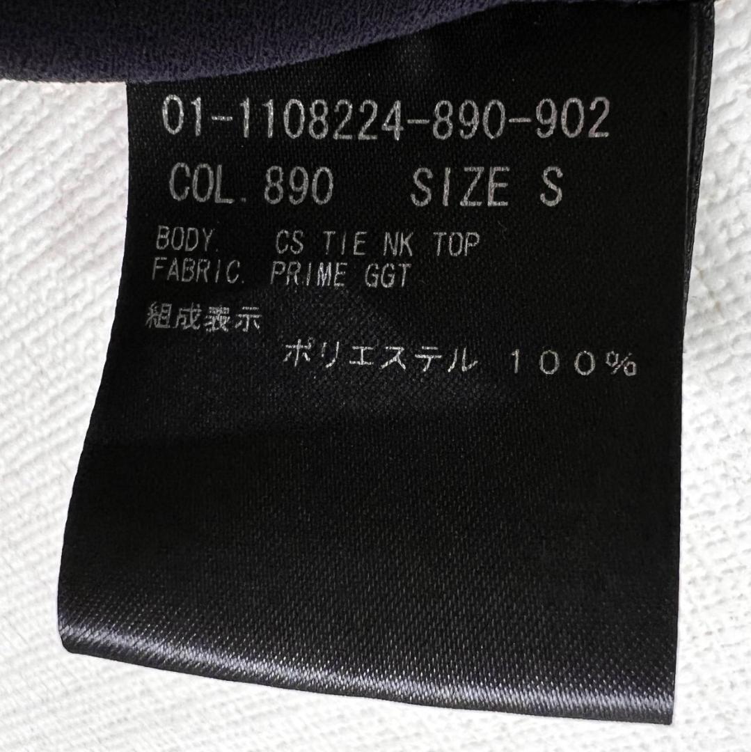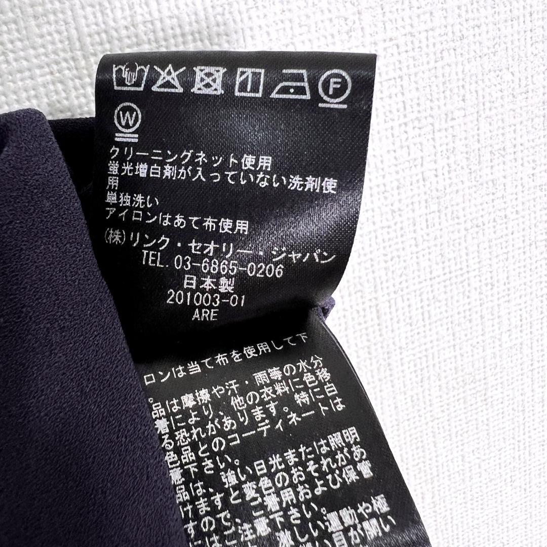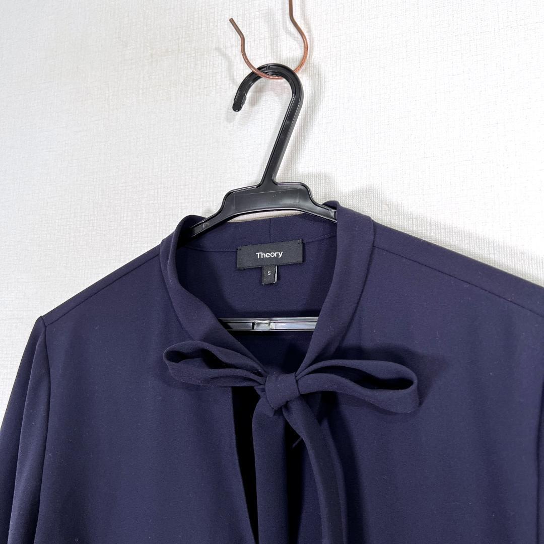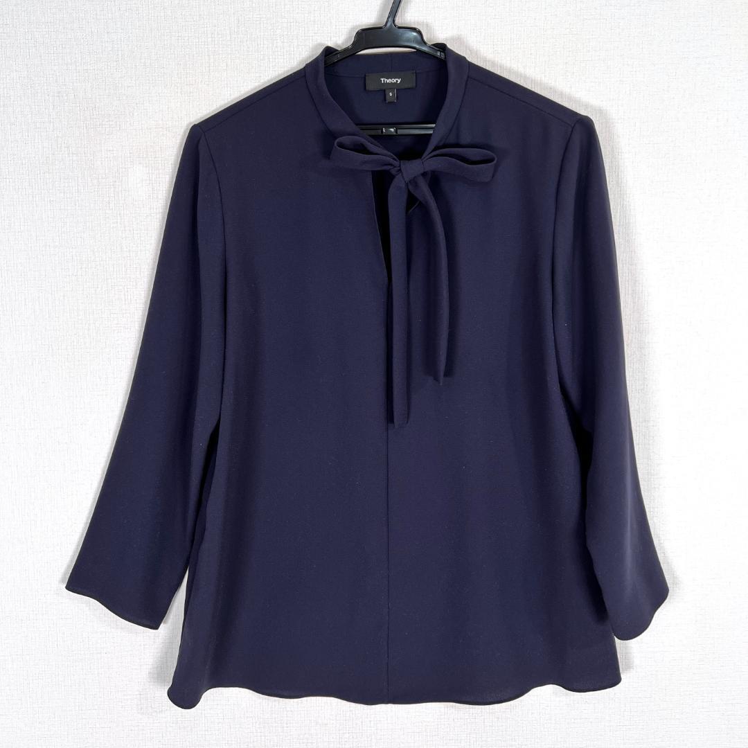 レディースのネイビー系の七分袖無地ブラウス ボウタイネックトップスです。首元のリボンが特徴です。中古品ですが目立つ傷や汚れもなく、まだまだ使えます。古着 セオリー 株式会社リンク・セオリー・ジャパン CS TIE NECK TOP