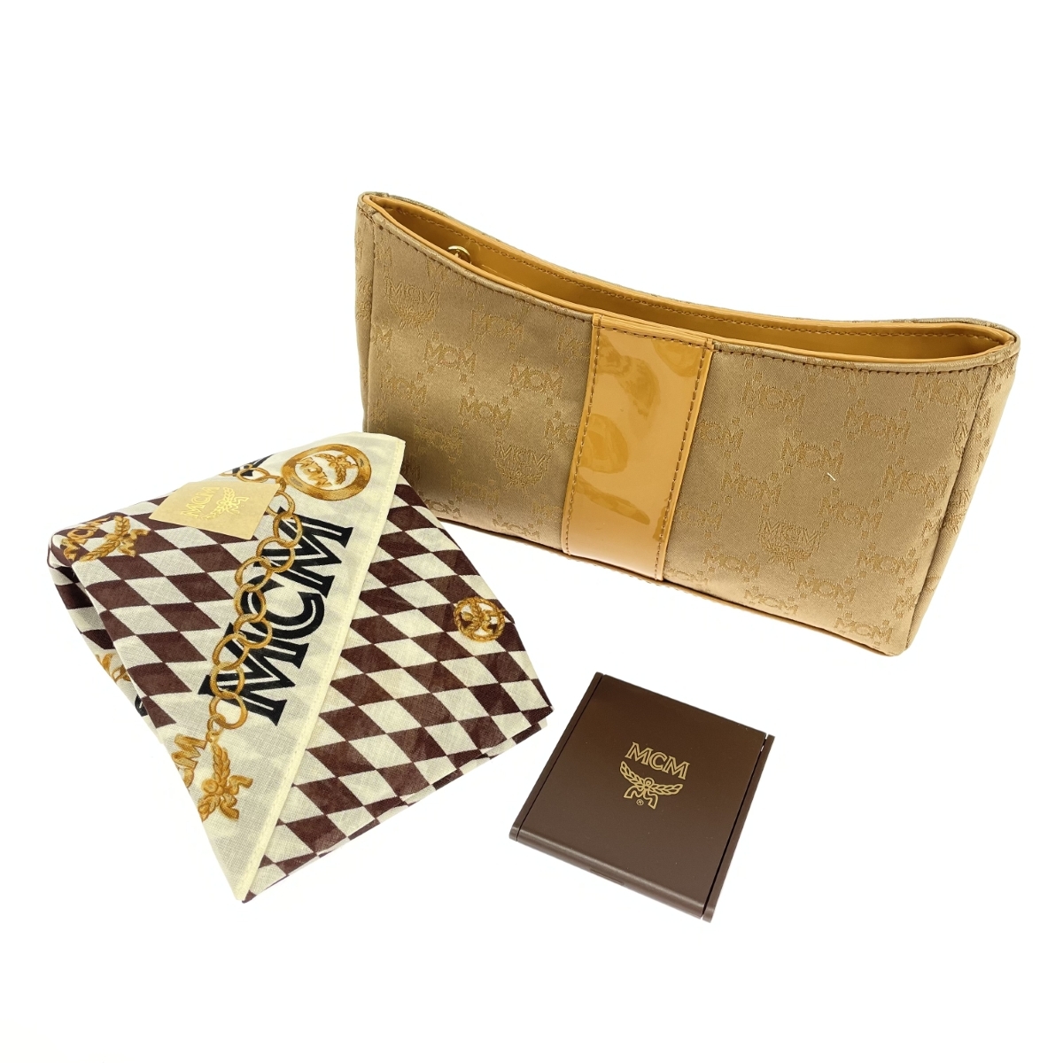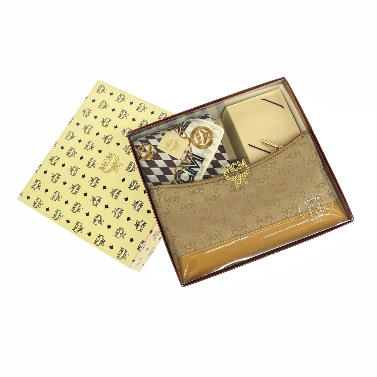 (ポーチ)W:19.0 xH:10.5 xD:4.5- (ミラー)6.3×5.5 (スカーフ)47.0×46.0 実寸サイズ計測方法はこちら |